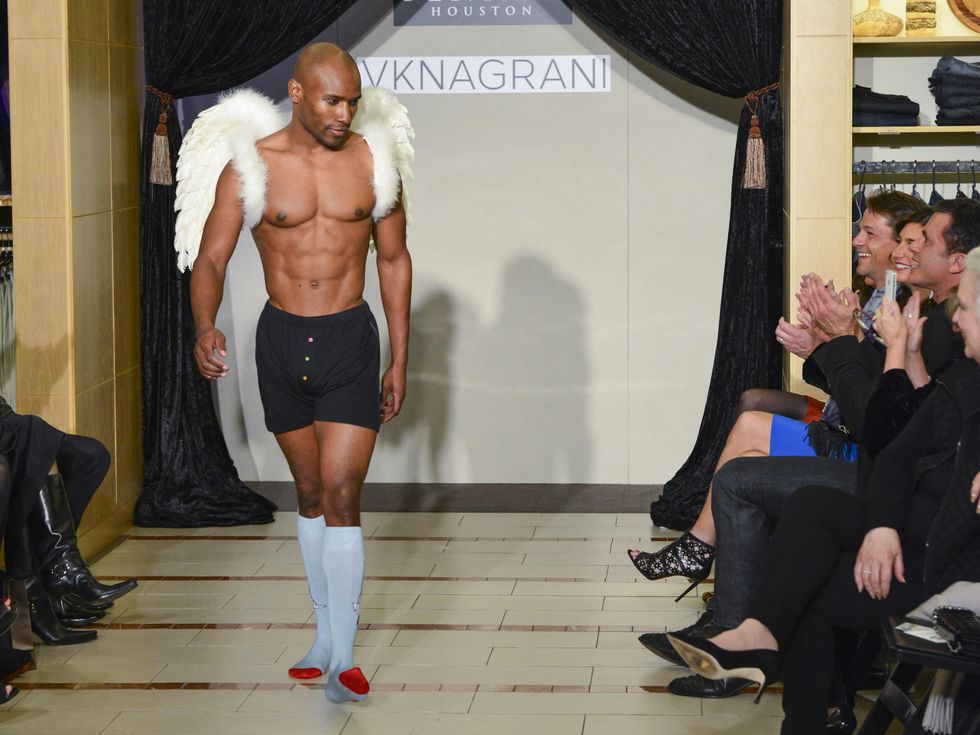 Topless male models wearing white angel wings and undies provided the eye candy while a procession of distinguished and/or rascally gents put forth the stylish entertainment. As might have been expected, State Rep. Gene Wu modeled a smashing tuxedo and even broke into a rare smile during his stroll down the catwalk. Hair stylist Ceron, on the other hand, was all antics as he owned the runway in his casual hipster sophisticate style. Most endearing of all was oilman Bob Bruni, making his modeling debut in fashionable casual wear.
