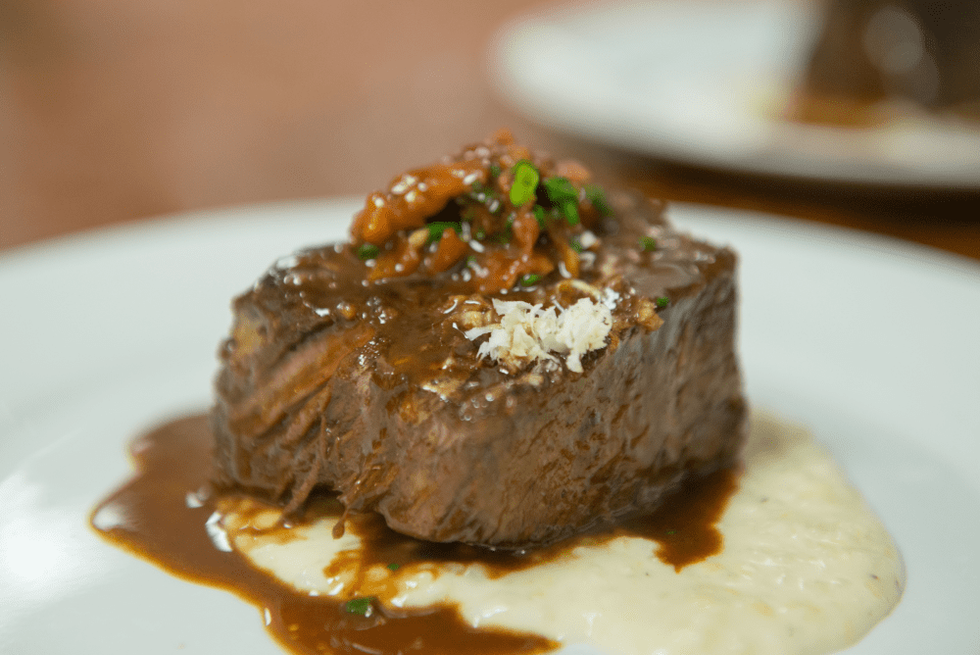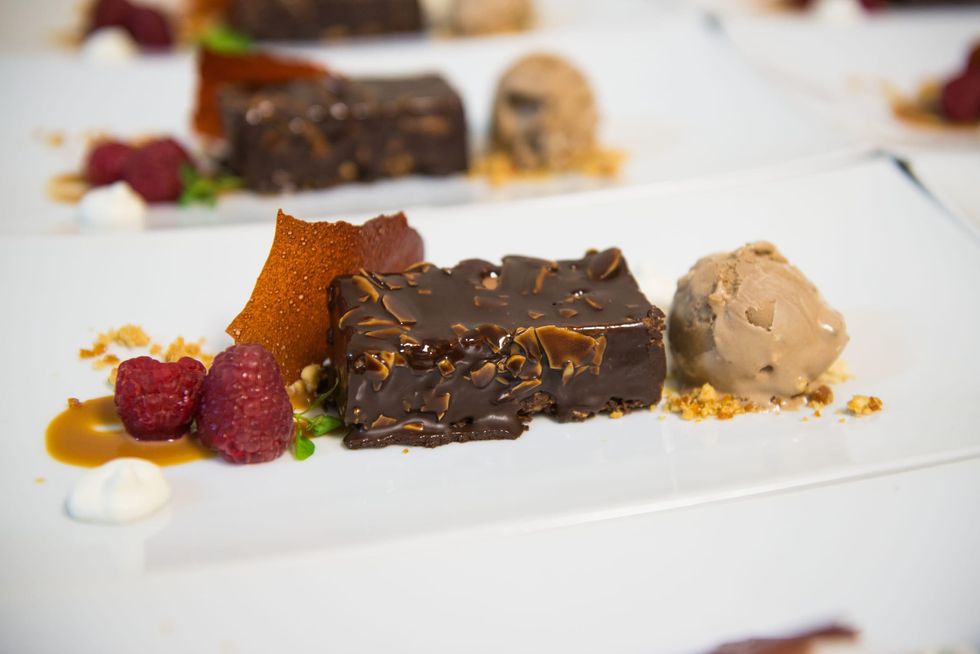 The menu — roasted beet Napoleons, handmade agnolotti pasta with black truffles, lobster with jasmine rice, short ribs with cheddar grits and a chocolate hazelnut bar with cranberry gelée, caramel and whipped cream — offered as Puck described it "a little bit of tastes from our restaurants." The wine pairings were selected by the Bhatias and Lindy and John Rydman of Spec's Wines, Spirits and Finer Foods, a regular sponsor of the event.