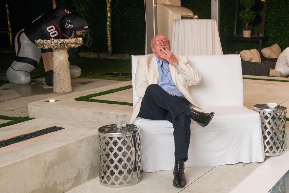 The merry throng overflowed from the swank contemporary interiors of the Loya home into the backyard where the pool was covered in acrylic for dancing, a Houston Texans logo centering the space. An open tent, hung with white glowing orbs, provided additional space where many of the gents with a taste for cigars puffed away. The University of Texas and Brigham Young game (disaster) was projected life-sized on an upper wall of the all-white exterior.
