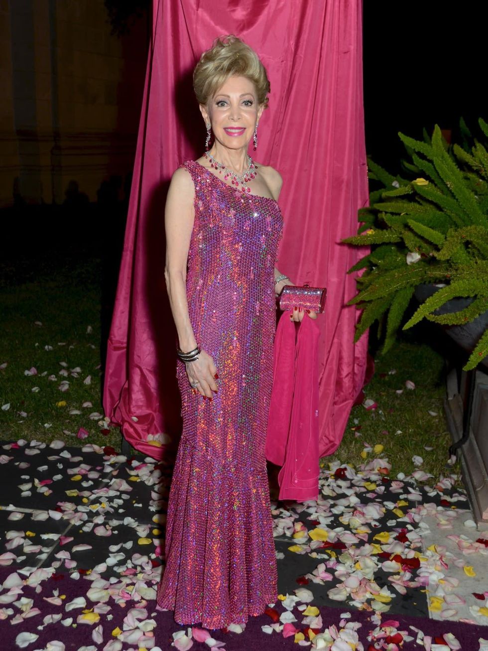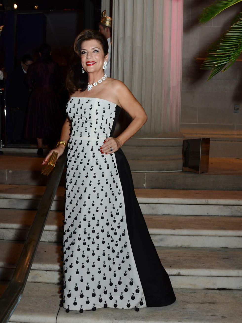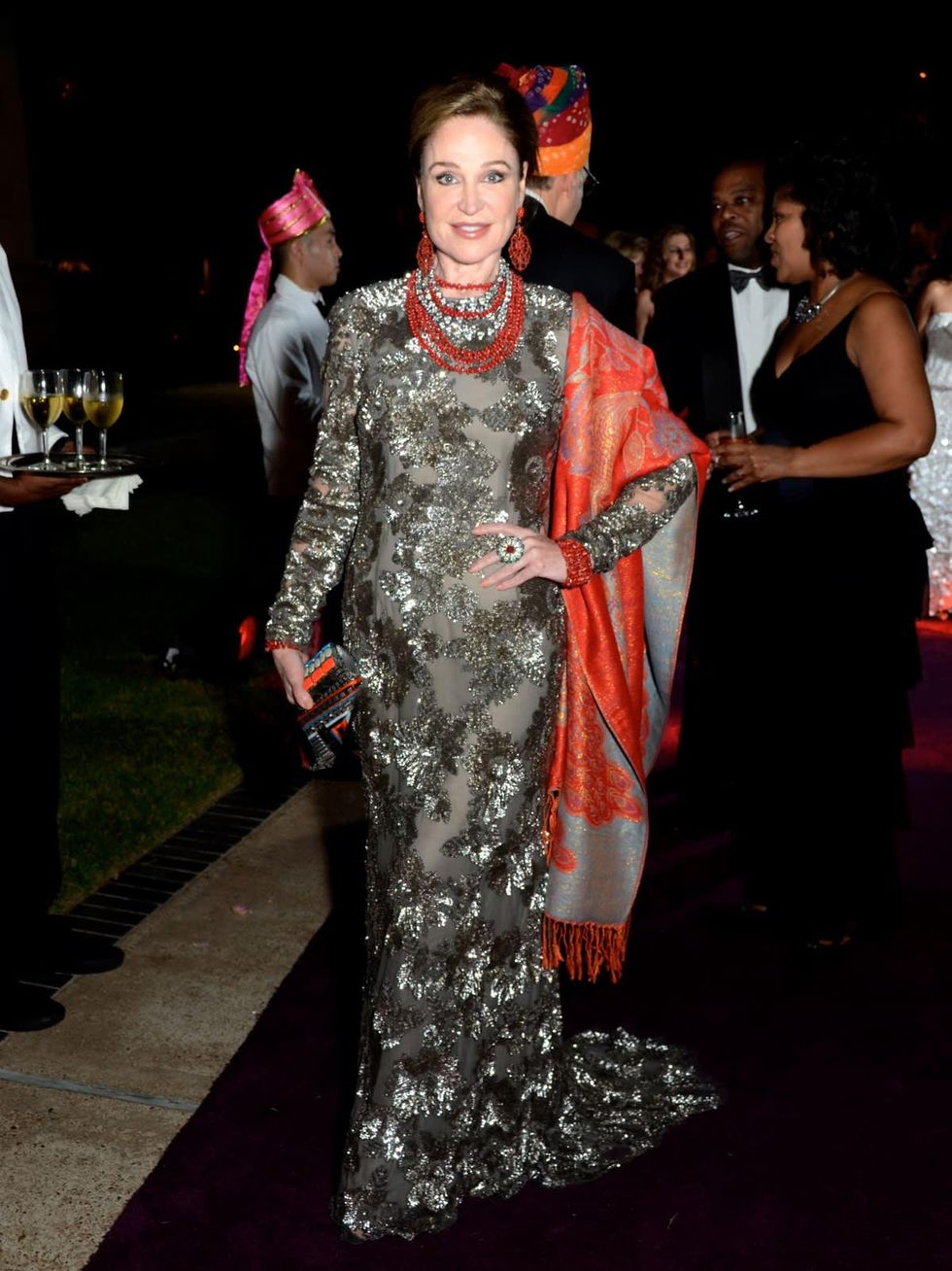 One of the most striking ensembles was worn by Lynn Wyatt, a white dress over white leggings with beaded accessories and matching turban. The design was made especially for her by Karl Lagerfeld for a party that she hosted in Europe.