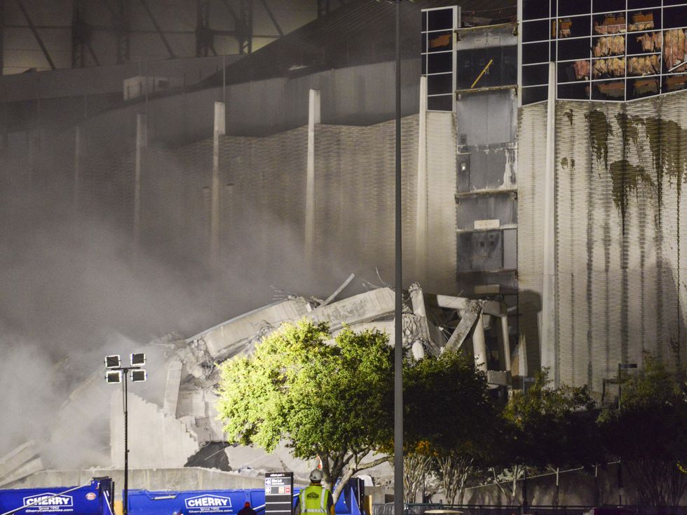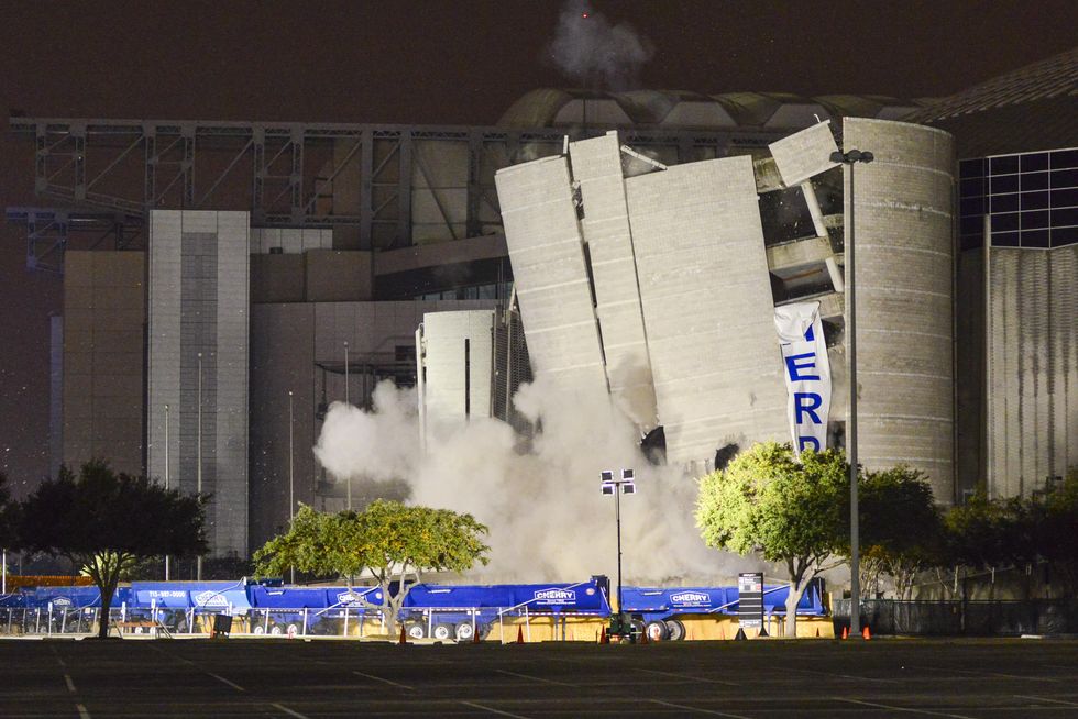It took only a few seconds Sunday night for three Astrodome ramp towers to come tumbling down. The round cylinders, which were added in the late 1980s to accommodate an expansion of 10,000 seats and luxury suites to keep the then-Houston Oilers from moving to another city (the team eventually left anyway), quickly imploded into a pile of concrete rubble as a group of onlookers watched.