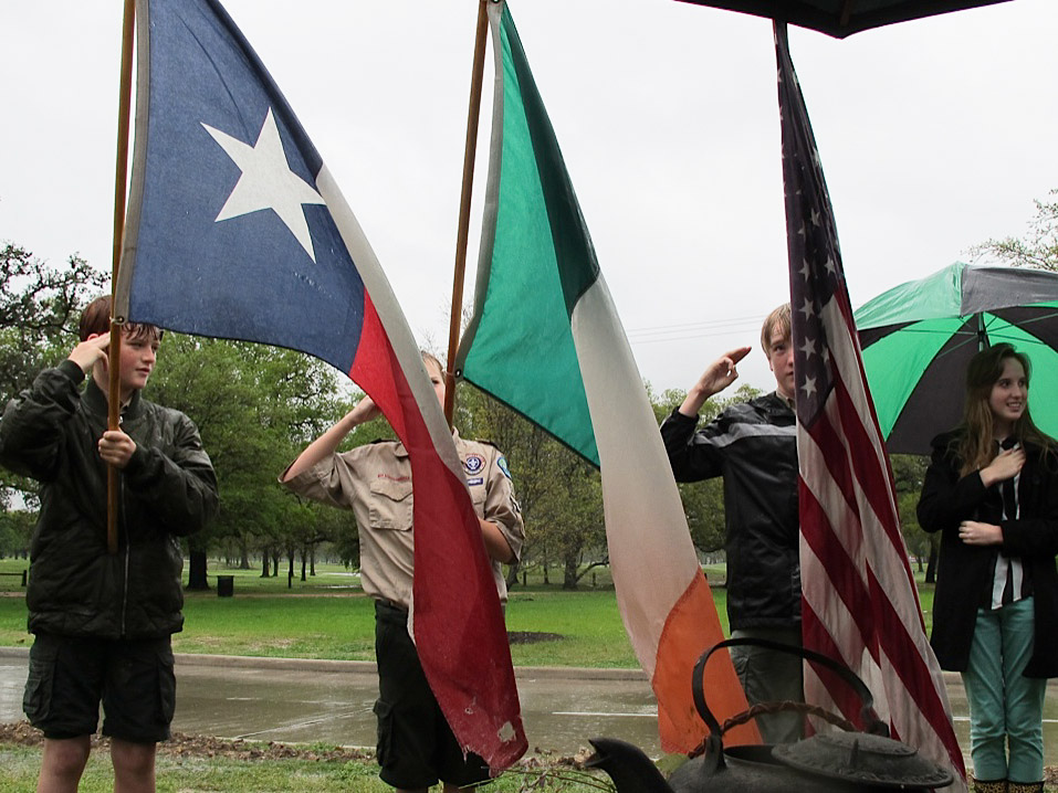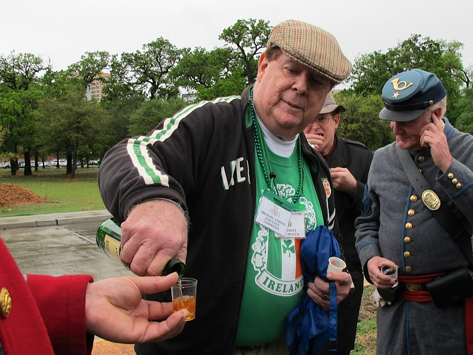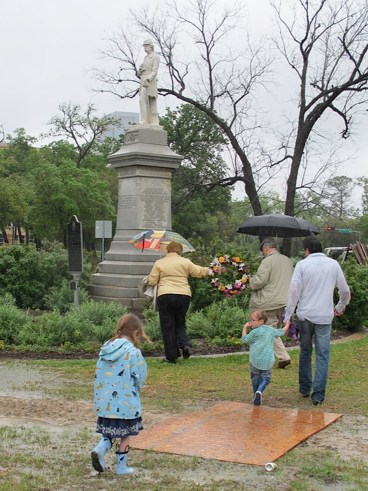 In spite of Sunday’s gullywasher, the 42nd Ceremonial Cleaning of the Dick Dowling Statue in Hermann Park took place. That morning, I stupidly made some phone calls to inquire if the event was still on but no one was home. When I showed up at the site wearing boots and a slicker, everyone was already in place and standing at attention. By days’ end, I was reminded that gullywasher or not, there is nothing more fun than spending an afternoon with the Irish!