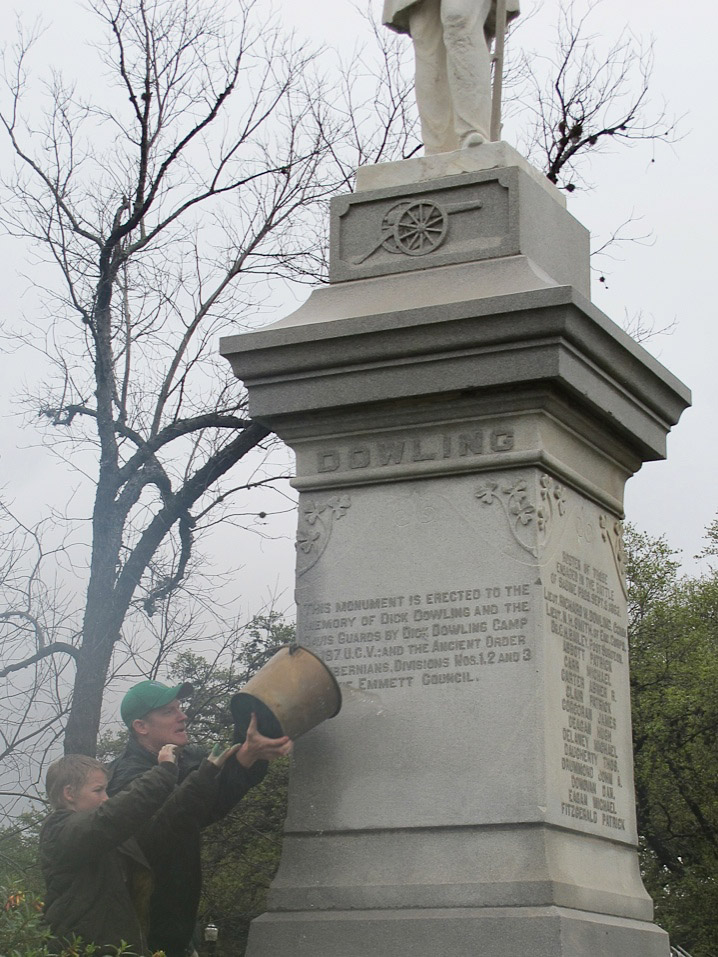 Afterwards came the ceremonial washing of the statue. With the gullywasher and all, I figured that the monument was pretty well cleaned. However, Larry Joe Miggins mixed his own special blend for the occasion. He poured a gallon of water into a brass bucket and added a wee bit of Irish whiskey from a flask. Of course, after the washing, toasting the honoree seemed appropriate.