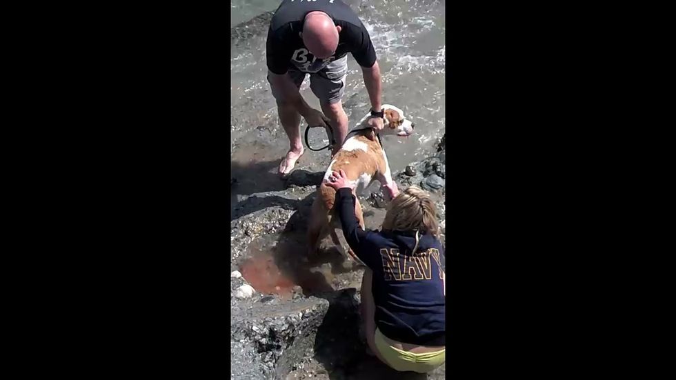 The YouTube footage (watch above if you wish, it's disturbing) shows three women attempting to free the creature from the big dog, which refuses to let go and proceeds to shake the sea lion in its mouth.