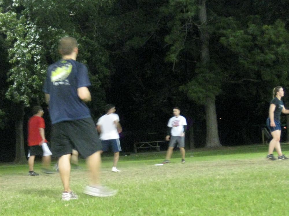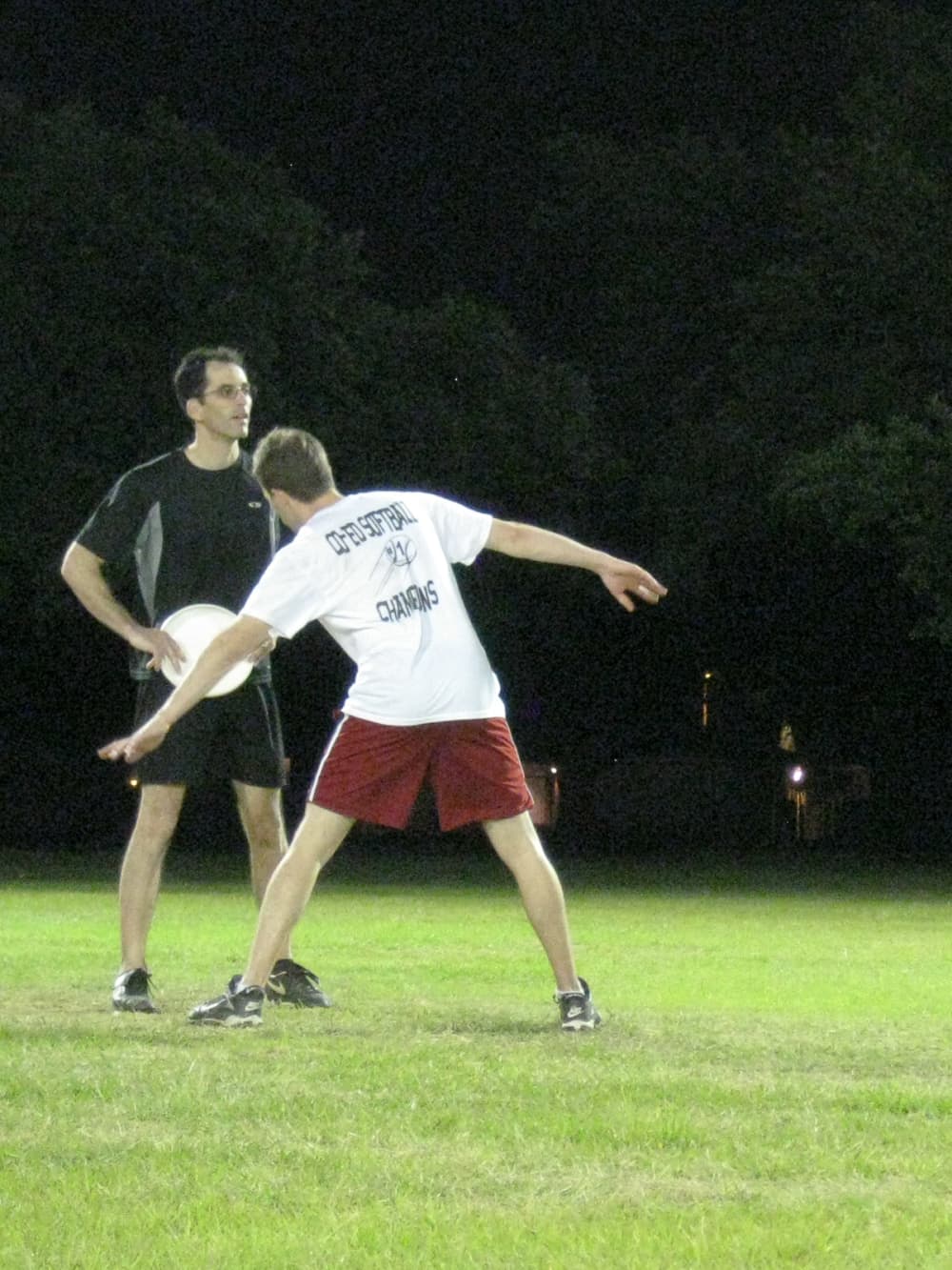 “It’s a fun, enjoyable way to get exercise,” says May, who sets up regular games. The Penultimates, as his loosely organized group is known, usually draw about 15 co-ed players to Jaycee park around 8 p.m. on Sundays, Tuesdays and Wednesdays. (Bring $2 to kick in for the cost of the lights.) It seemed like half the people there were playing with the group for the first time after finding it on the Internet.