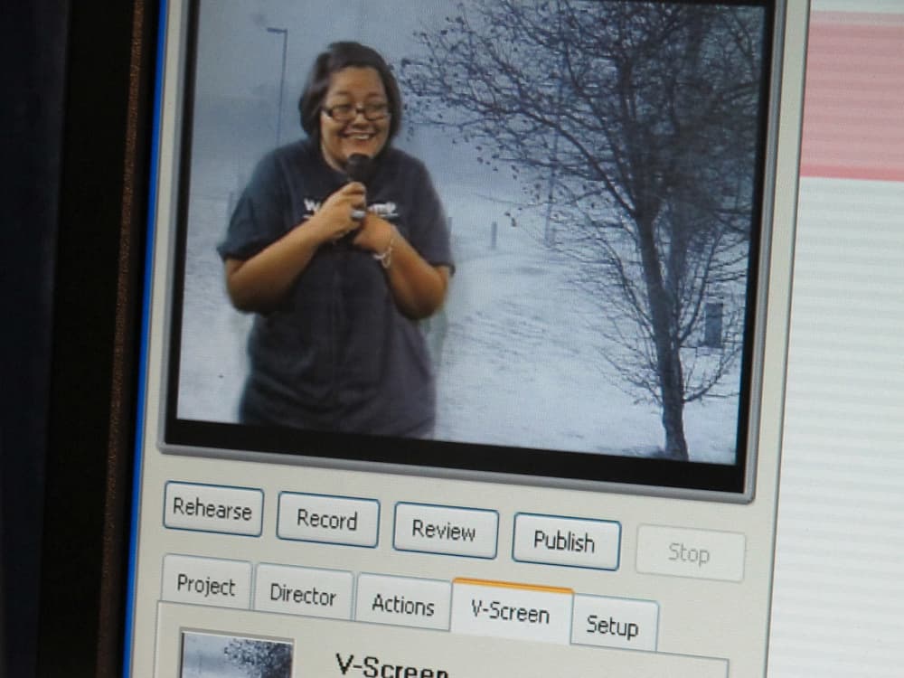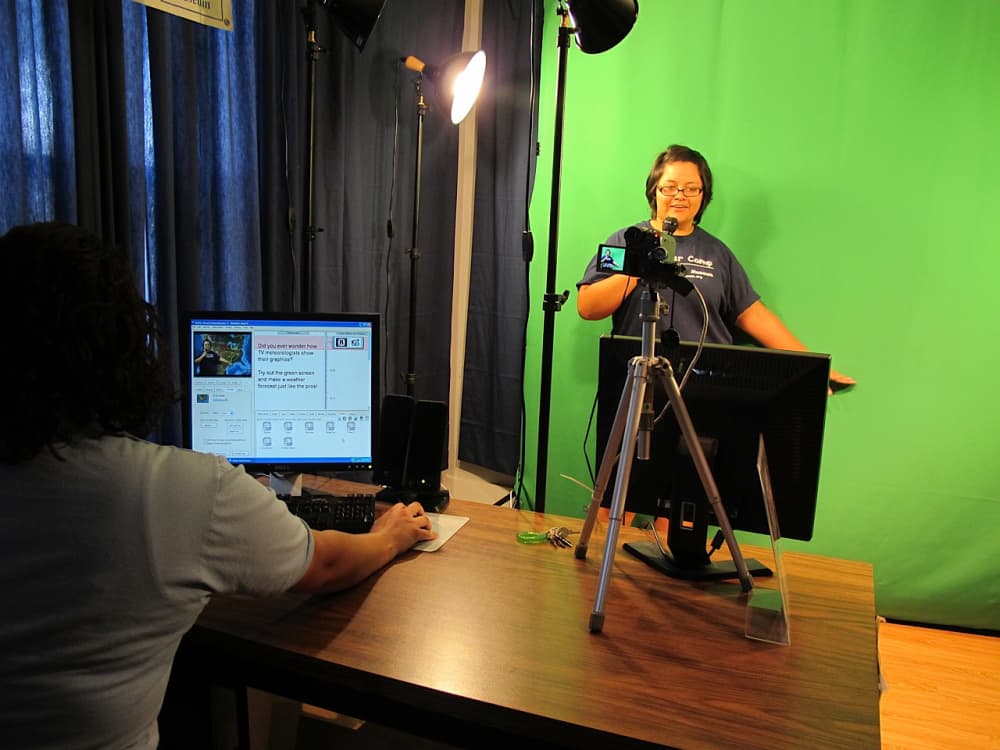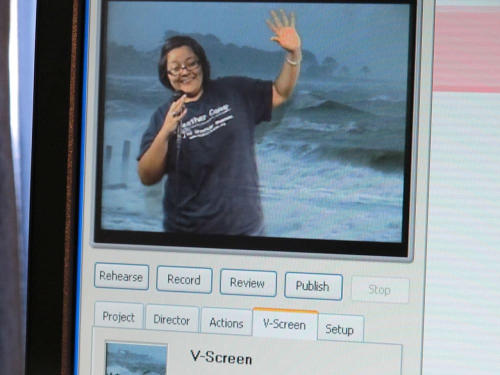 Eliana Perez, Weather Museum coordinator, gives a forecast in the Green ScreenRoom.Photo by Katie Oxford