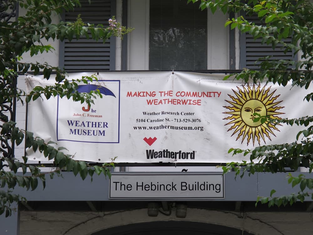 The signage out front reads The John C. Freeman Weather Museum at Weather Research Center. Dr. John C. Freeman (since deceased) was a meteorologist and oceanographer. He had been active in his field long before he and his daughter Jill F. Hasling (president and a certified consulting meteorologist) opened the museum.