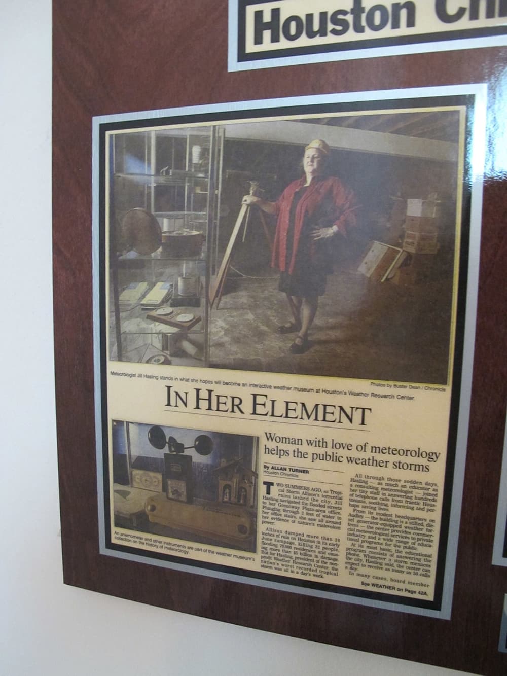 Jill Hasling was out of town the day I visited the museum, but framed and hanging on a wall is an article from the Houston Chronicle, with a great photograph of her. She’s wearing a hard hat and holding one hand on her hip, standing amongst weather instruments in the yet to open, interactive weather museum. The title of the article reads IN HER ELEMENT. It sure looks like she’s home.
