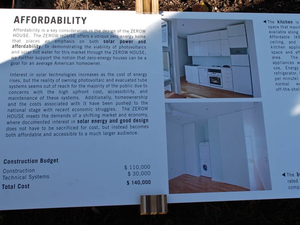 The Rice University team's design was based on the architecture of the shotgun homes in the Third Ward, dubbed the ZEROW House to signify both the use of zero outside energy and it's ultimate destination as part of the Project Row Houses. It ultimately finished the competition in eighth, but ranked second in architecture and market viability and, coming in at under $100,000 without the cost of the solar panels, was by far the most affordable structure. As The Huffington Post noted, the decision to produce just enough electricity to power the house was practical for the market but hurt their overall score.