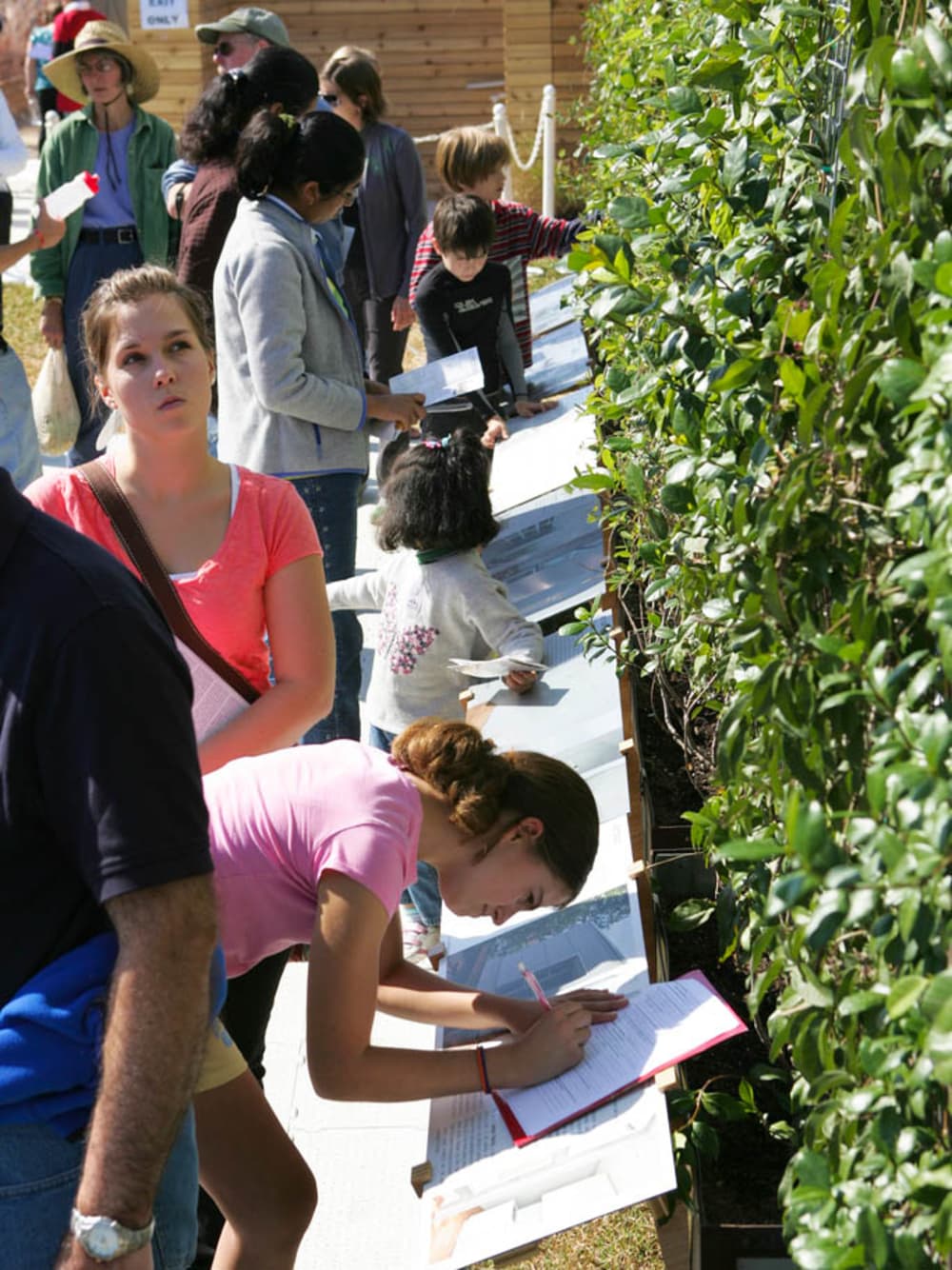 Catie Beckhorn, 13, front, who is working on her school report on the U.S.Department of Energy Solar Decathlon, writes down information about RiceUniversity's green wall used to provide passive cooling and aesthetic appeal fortheir solar-powered house.Stefano Paltera/US Dept. of Energy Solar Decathlon