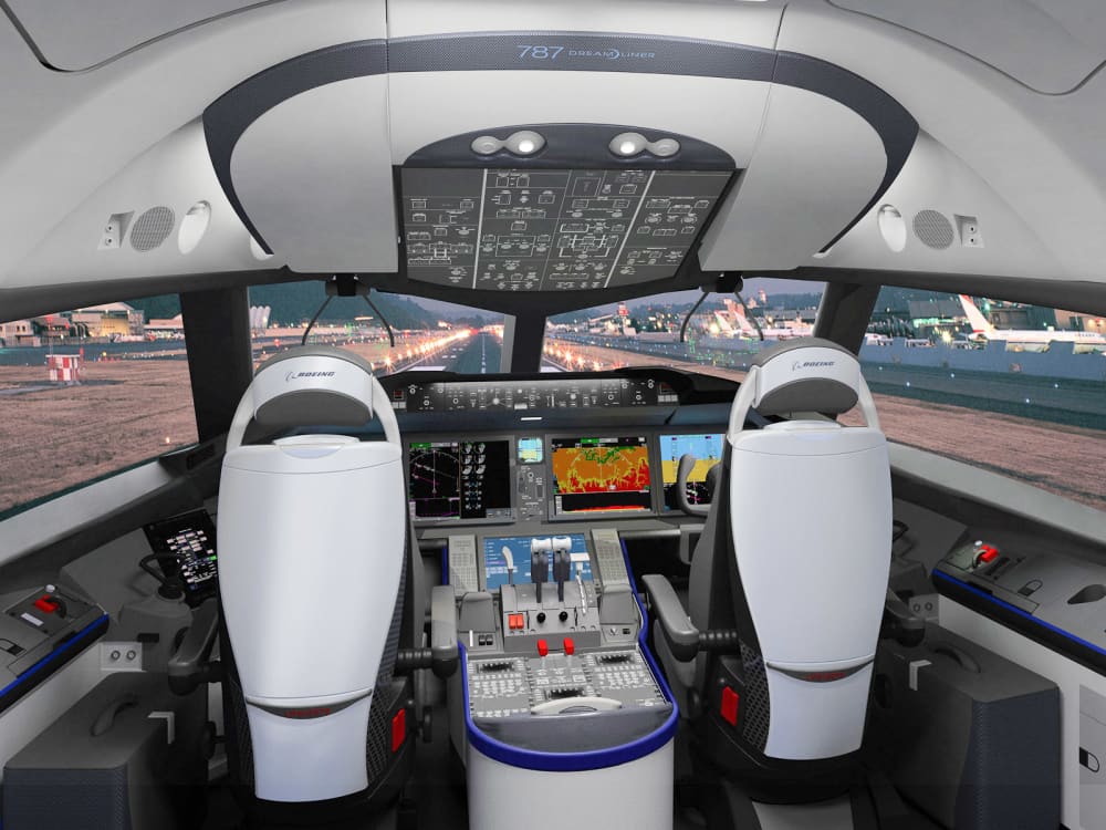 Key features of the Dreamliner flight deck include larger displays, dual head-updisplays and dual electronic flight bags.Boeing Graphics