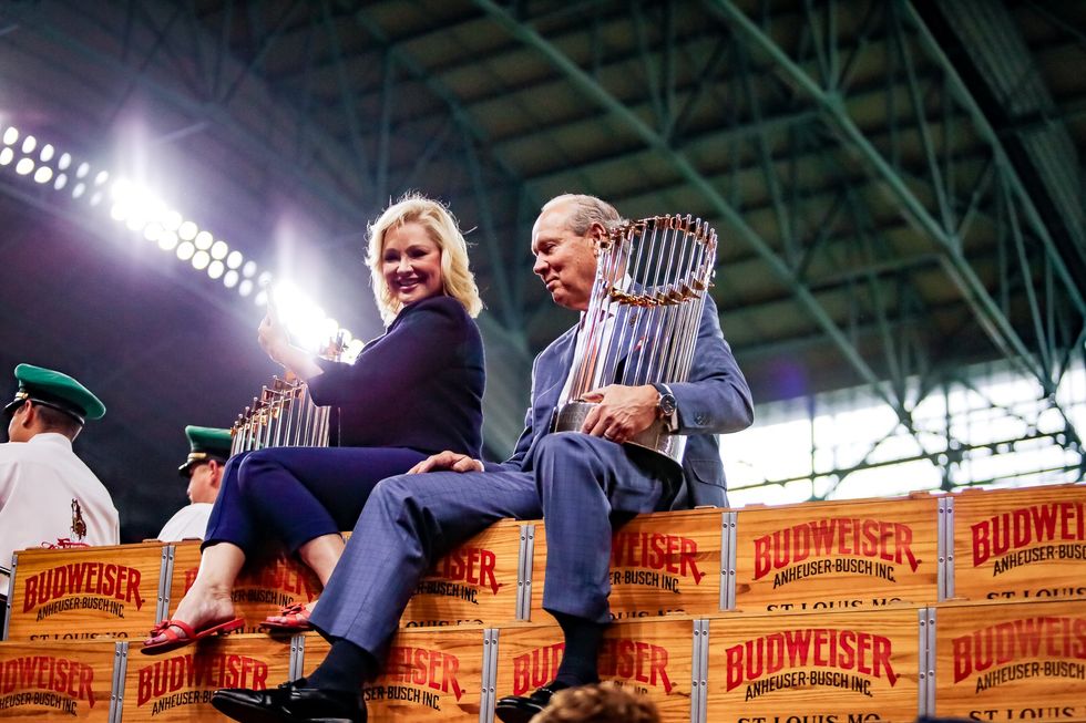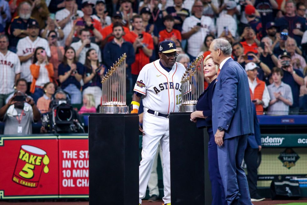 Astros owner Jim Crane and wife Whitney literally rode in with the World Championship trophies and joined manager Dusty Baker, Jr. who asked the eager crowd: "Are you ready for another one?" — to an enthusiastic roar. After a big reveal of the new season slogan "Ready 2 Reign" and appearances by Wahlberg, the Cranes, a ceremonial first pitch by Megan, it was game on.