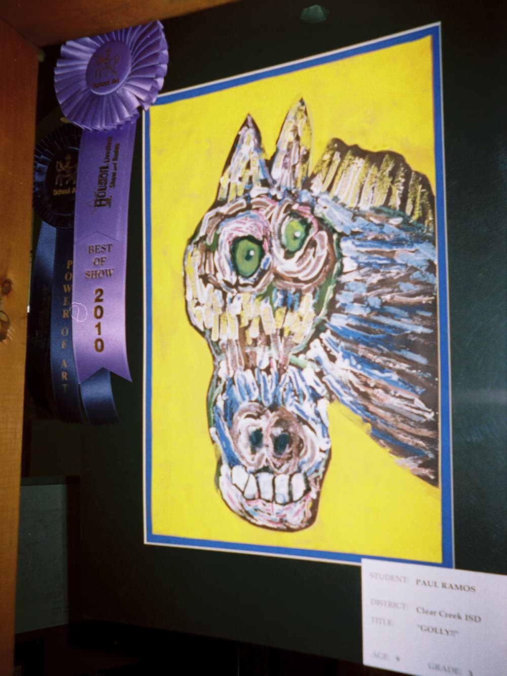 I got nose to nose with a horse, painted by Paul Ramos, a third-grader from Clear Creek ISD. The title read “GOLLY,” which I’d call not GOOD but GREAT. “GOLLY” is the head of a horse with eyes looking straight (or rather not so straight) at you with a background the color of overcooked corn on the cob. I chuckled, thinking “this horse’s expression is exactly how I FEEL when P and I are having a heated argument.”