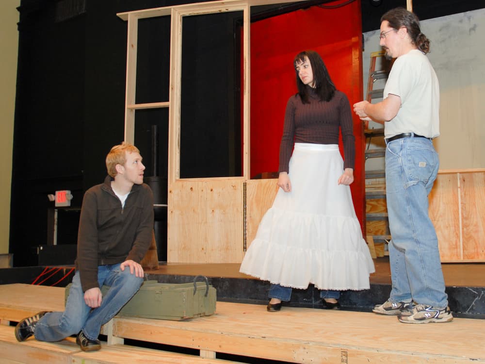 Byrnes, an associate professor at UH, is known as Houston's leading fight director, but he's also a playwright and a busy director. Yet the sword stuff penetrates his thinking; he's an intensely physical guy. In addition to directing his first opera, he's also designing the set with Clinton Hopper's assistance. I popped in to see what kind of mayhem Byrnes was stirring up at OH's cozy headquarters. I stepped through lumber, sawdust and other signs of a vision-in-the-making to get to my seat to watch the long-haired director at his new gig. Insiders tell me it's the most elaborate set so far in an OH production.
