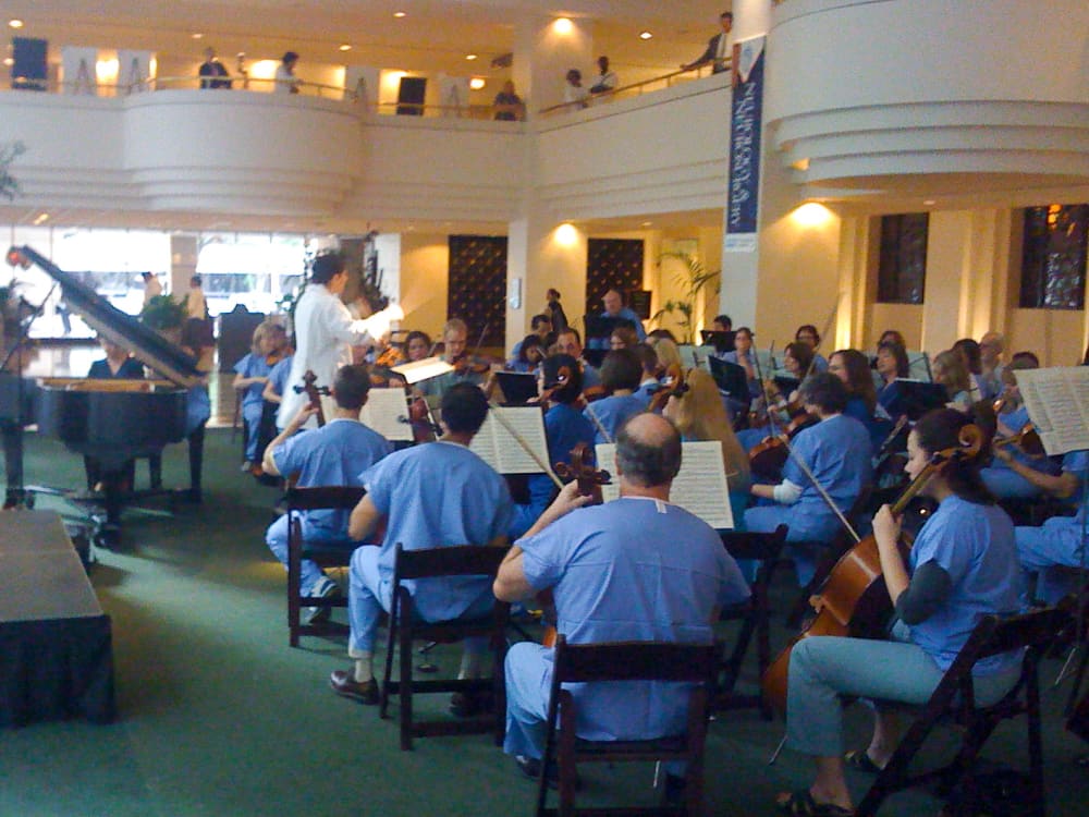 For the 200 listeners in the audience, which included administrators, medical practitioners, world-renowned surgeons, patients in wheelchairs with intravenous infusion apparatuses, families, friends and children — and the hundreds passing by — it was a much needed respite from the frenzied hospital.