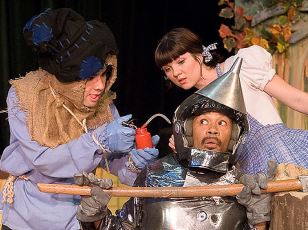 Scarecrow (Jonathan Reavis) and Dorothy (Lori Yonley) give the Tin Man (Don KirkDautrive) a good oiling in InterActive Theater Company's "The Wizard of Oz."