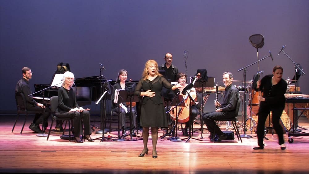 Soprano Karol Bennett, center, and actress Susan Koozin, right, trying to catcha folk song in "Around the World with Musiqa"Photo by Bill Klemm