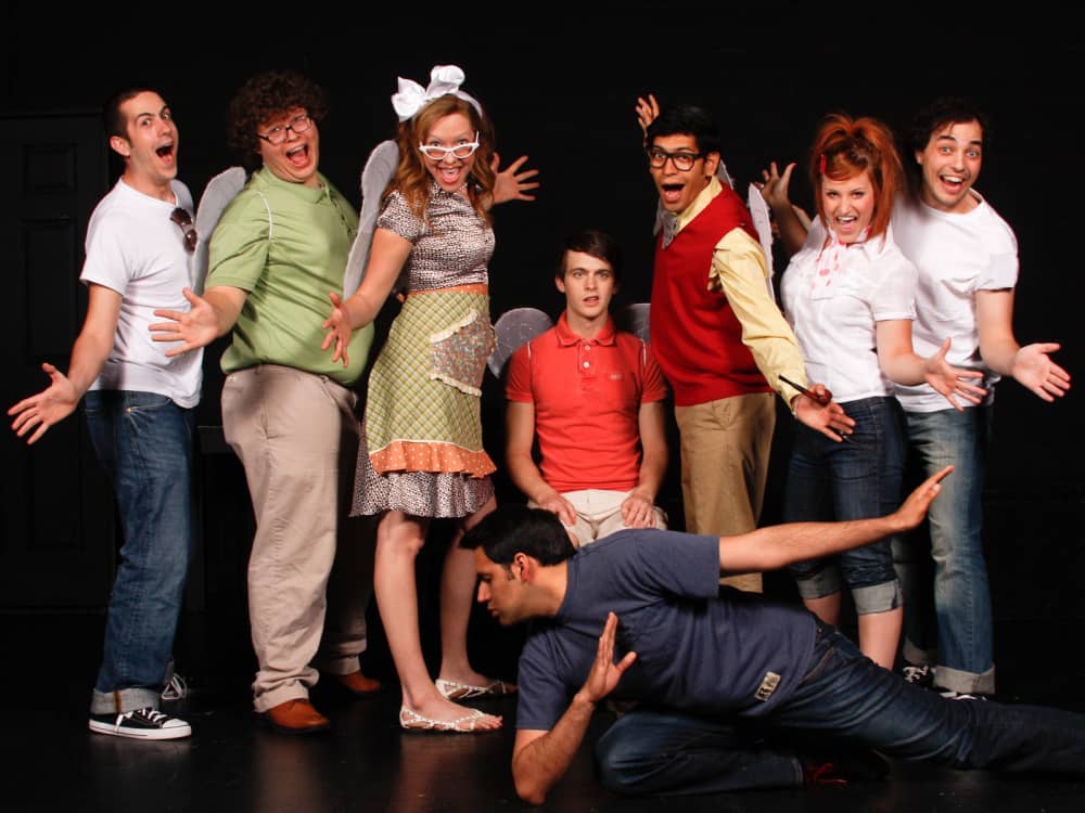 Cast members in "Kelly, King of the Faries," (from left): Ben Mattice (Mikey),Jason Ronje (Eugene), Abby DeBolt (Fern), Shane Dorman (Kelly), Paul Salazar Jr.(Leslie), Traci Thiebaud (Susan), Adam Sowers (George) and on the ground,Salvador Chevez (Nelson).Photo by Mike Dorman