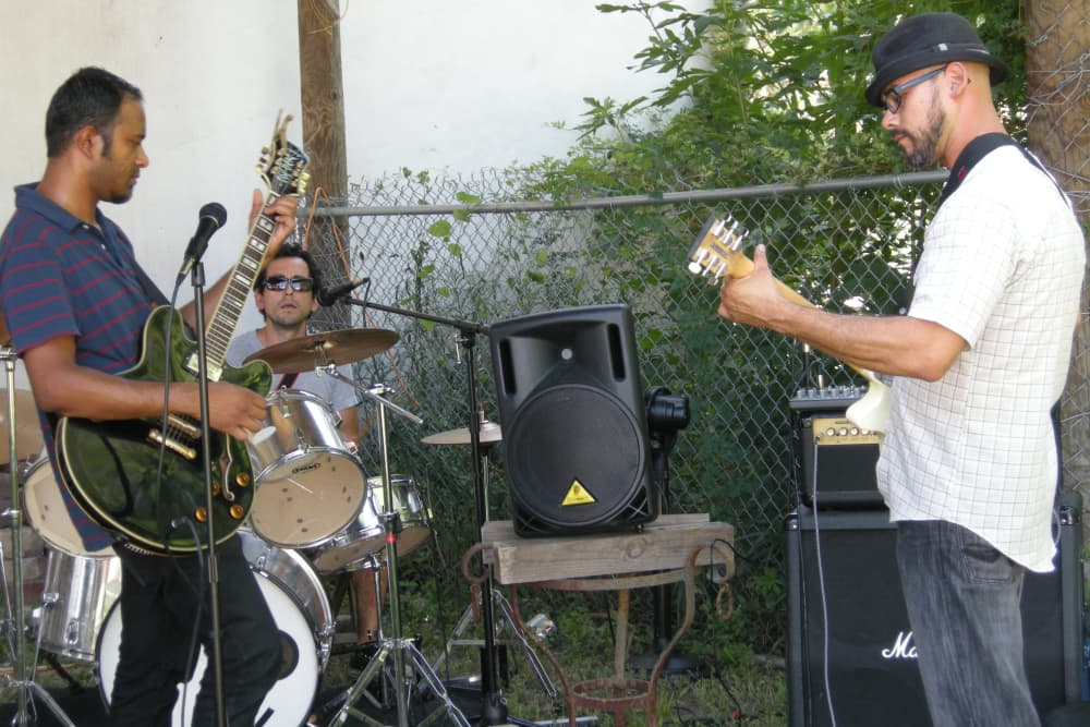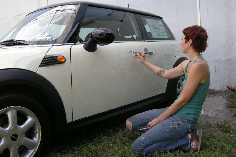 This afternoon at the lot adjacent to Gallery M Squared, the artists were hunched over car-side, paintbrushes in hand. Robynn Sanders, the winner of the 2009 Art Car Parade, was scrawling the outlines for a robot-themed work.
