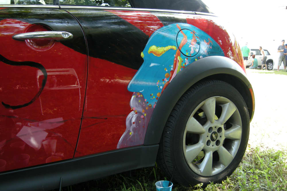 The band Wailing for Sex Jennies contributed good vibes as renowned art car artist Rebecca Bass effortlessly brushed Peter Max-inspired images onto a cherry red model with Julian Luna. Bass is implementing groovy imagery from the iconic flower power artist's repertoire. "It's all about color," she says.