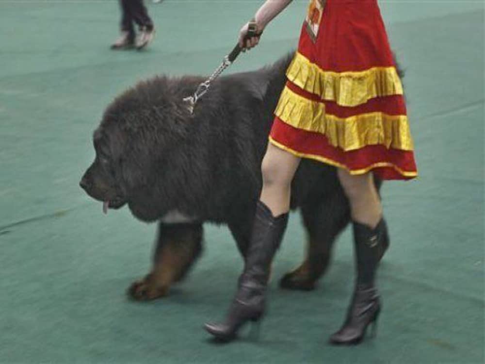 A female model walks a Tibetan mastiff dog during an annual China TibetanMastiff Expo on the outskirts of Beijing, China, in March.Photo by Gemunu Amarasinghe/AP