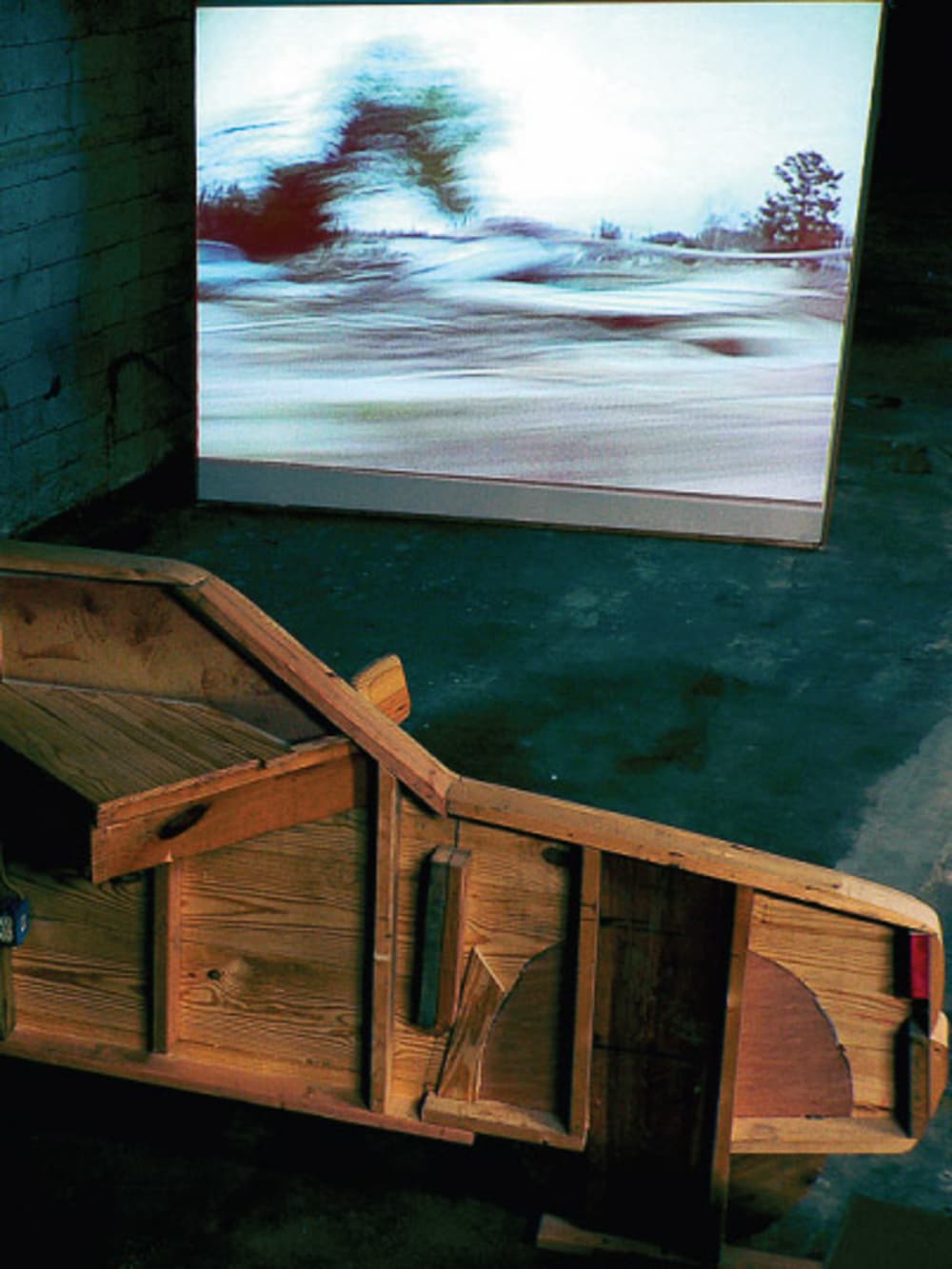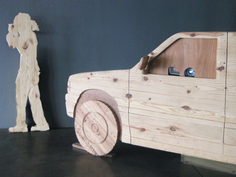 From "On the Street," front view of a life-sized wooden vehicle and a full bodyimage, which represents the Crier and his personal vehicle used whiledocumenting the disaster in the Lower Ninth Ward one month after Katrina hit