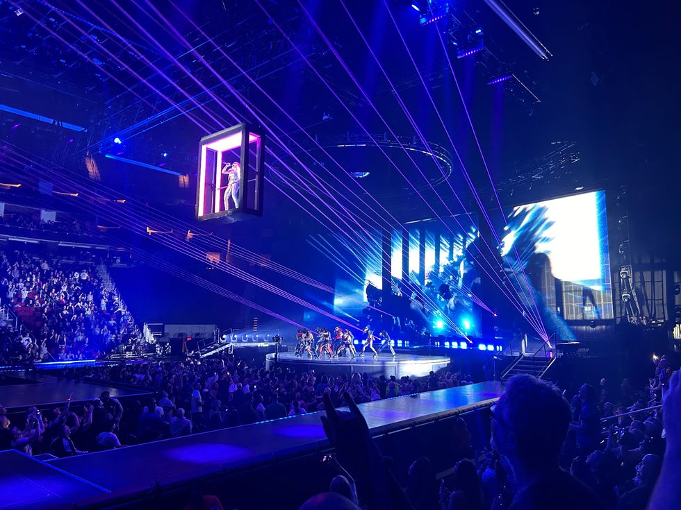 Act VI took it home with one of the best moments of the night with late-‘90s comeback tune, “Ray of Light.” Madonna hovered over the crowd in a floating truss in a reflective outfit, pink wig, and futuristic glasses. Lasers mimicked a prism across the stage as the heavy techno remix got fans dancing in the aisles.