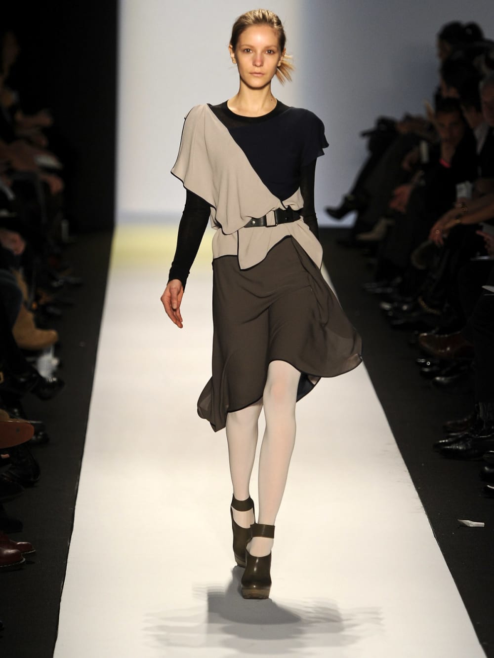 At Milk Studios, the MAC-sponsored venue in Chelsea, Gwen Stefani unleashed her LAMB collection. It was all very “Do Ask, Do Tell,” with cheeky military refs—knit sweaters wrapped round with thin military belts, vivid camouflage pants topped with a shirt and leather corset. Other corsets—or were they strait jackets??—hung loose, haphazard, down the back like aprons.