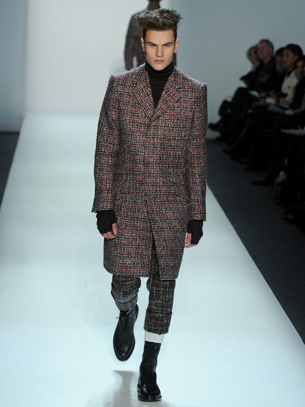 That show—flush with a mix of plaids (one plaid on a blazer, another on a workshirt, a third on knickers, all worn together along with smart, tailored Crombie coats—might have pleased McQueen, who wore a tartan kilt to the funeral of Isabella Blow, his friend and muse who committed suicide herself back in 2007. (Weed killer. Yikes.)