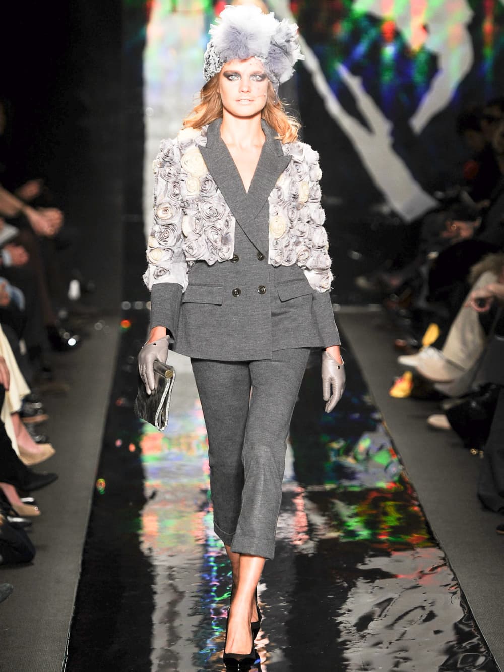 Osbourne returned in a Chaplin-esque get-up, then as a wicked widow in a frilly black strapless. The finale included a parade of models tossing into the air massive balloons in the shape of lips. And then came Betsey, in inmate-striped long-johns, who did her signature cartwheel down the runway—revealing a bright pink sequined heart sewn on her butt. Well, after all—it was Valentine’s Day.