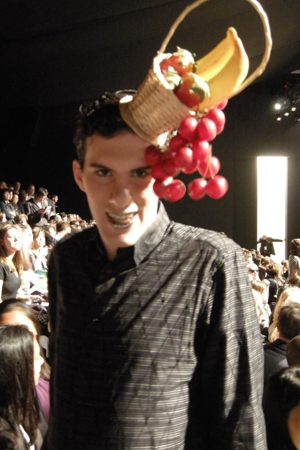 My hoped-for encounter with Julianna Marguiles didn't take place at the Narciso Rodriguez show Tuesday night, because she wasn't there. I instead talked to a young freelance stylist who sat next to me wearing a basket of plastic fruit on his head. "I try to wear avant-garde to every show," he explained. "This is how I get all my work."