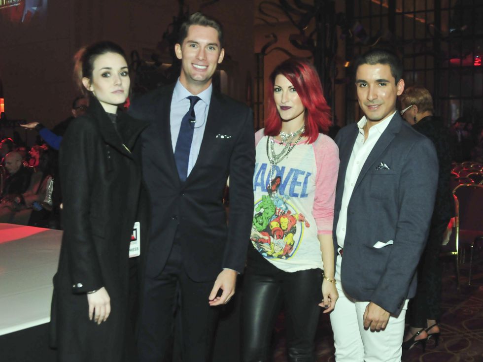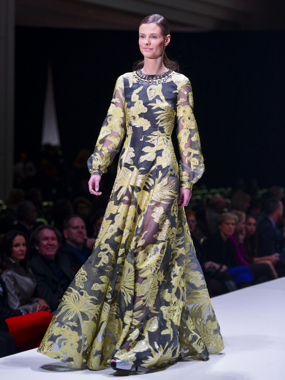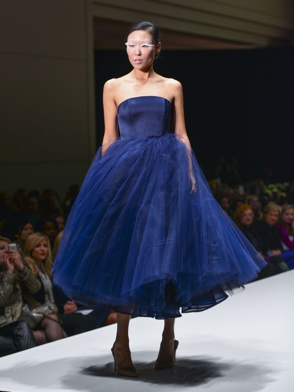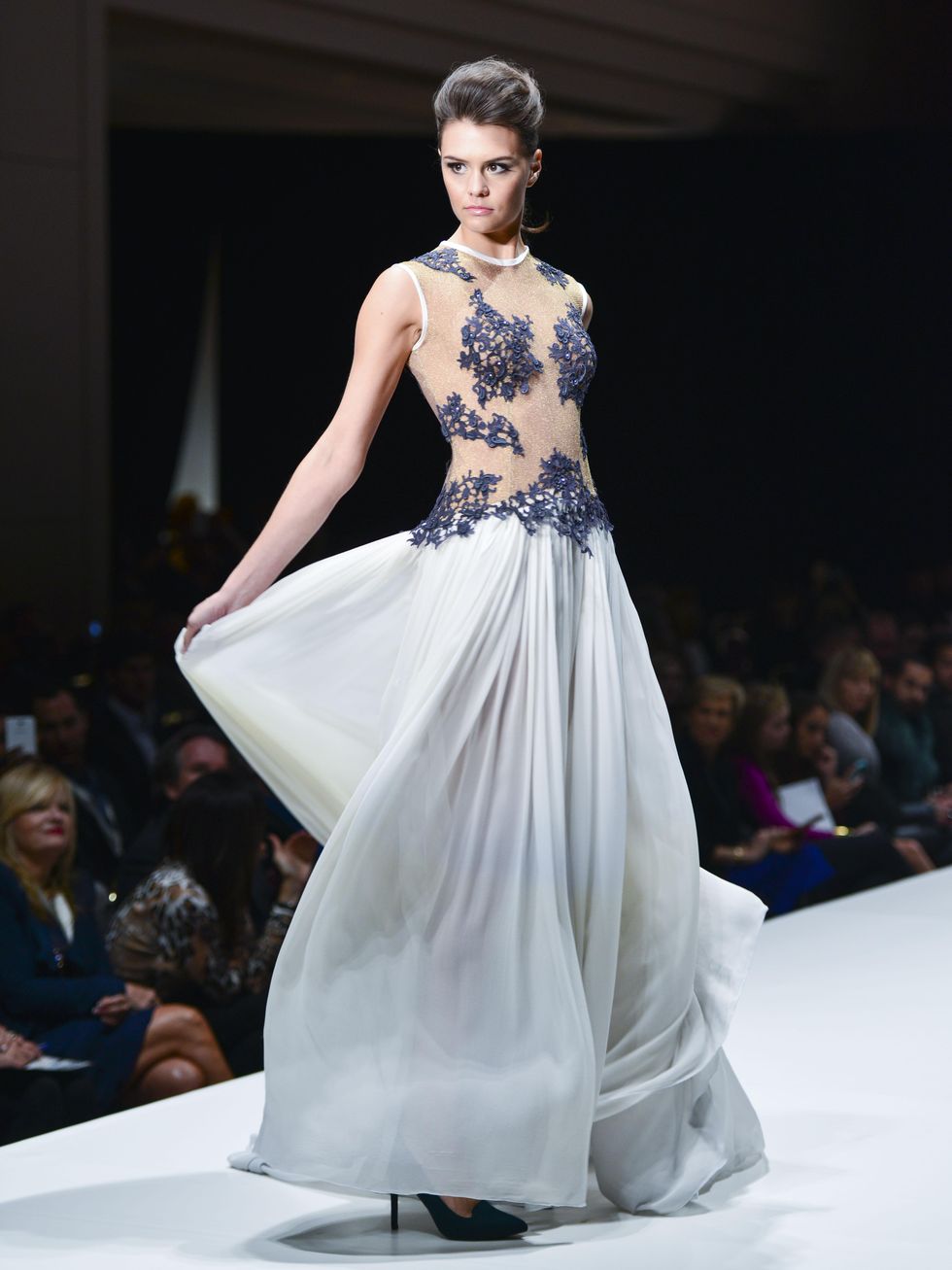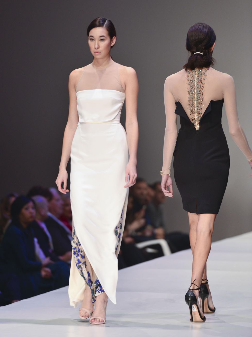 While it was chilly outside, the looks on the runway were aimed at warmer weather, with resort and spring 2014 collections that exuded a cutting-edge sensibility. London-based designer Marios Schwab kicked the evening off with an edgy collection that featured body hugging dresses in airbrush patterns or shredded with indigo-dyed denim, sheer gowns with sequin underlays, and a series of striking white gowns with semi-precious stones cascading down the back.