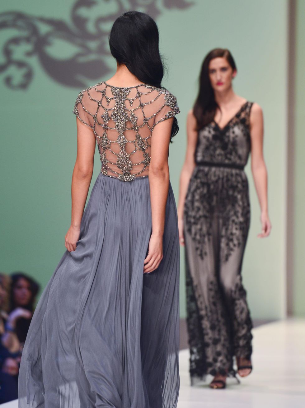 Each model's hair was swept aside to show glittery back detail of gowns and dresses, a growing hallmark of a Deane design. One gown, with rhinestone back detail worn by Houston model Yuan Yuan Zhang, drew applause from the audience.