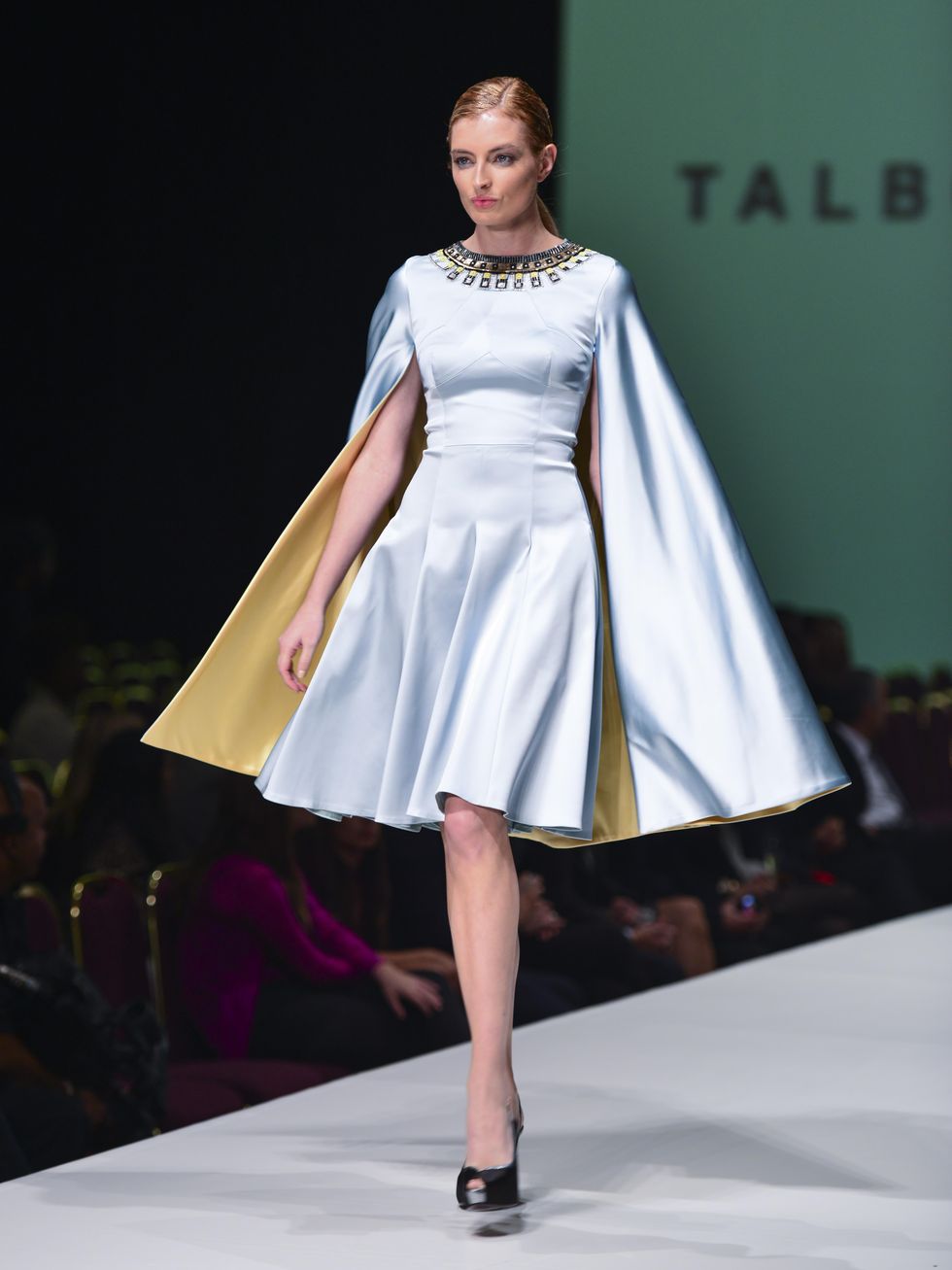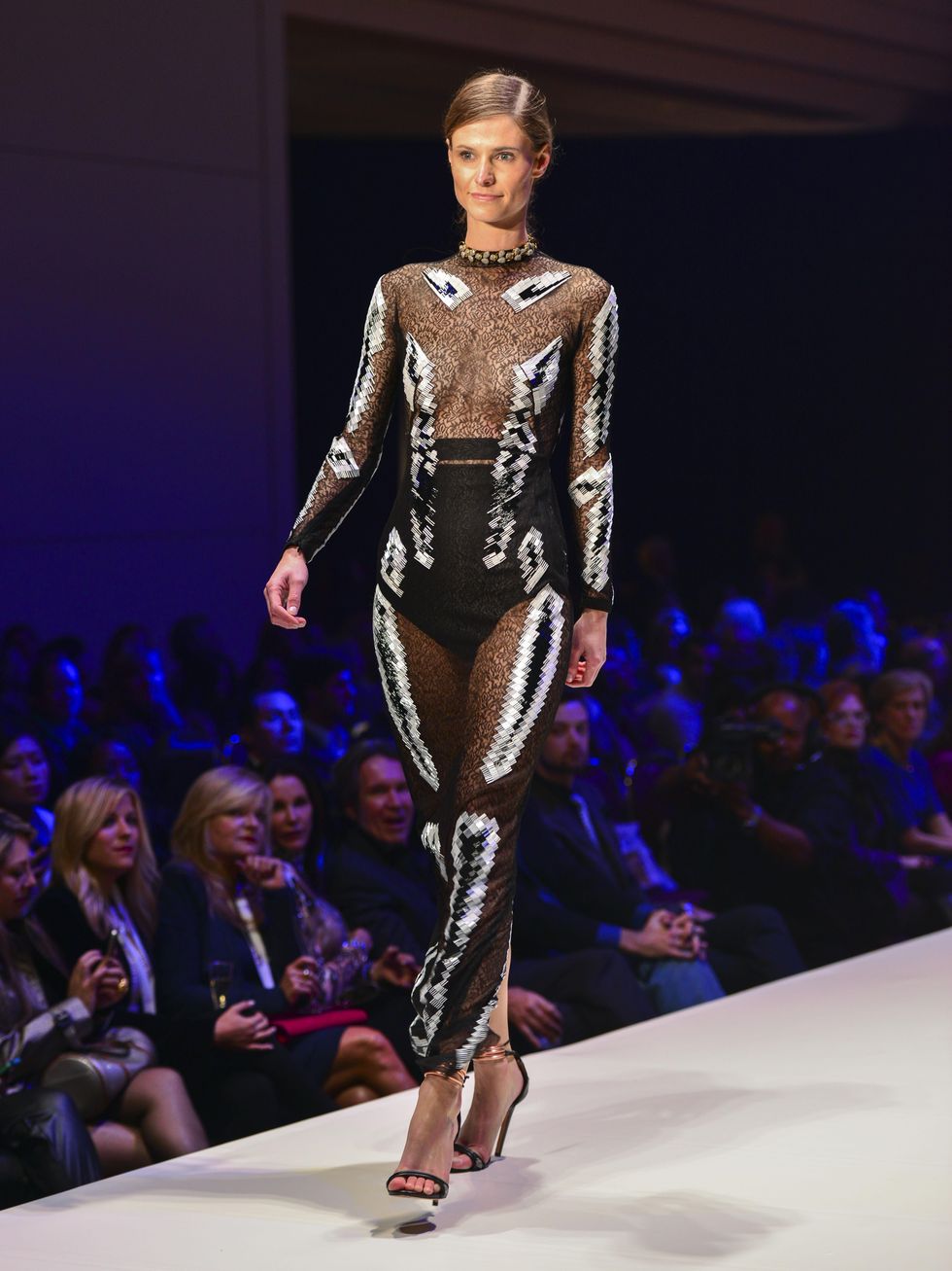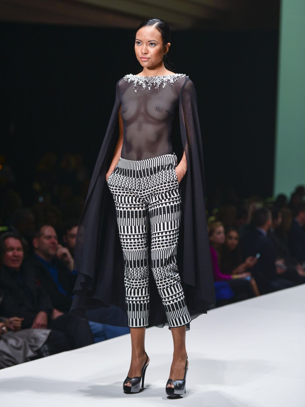 The design duo of Johnny Talbot and Adrian Runhof closed the evening with a strong collection of black and white geometric prints (they call it "white and black"), sometimes mixed with jacquards, tweeds with hologram foil flowers, dresses with capes lined in contrasting colors, and a Catwoman-like black stretch leather gown that will have everyone purring. While the gowns were edgy, they were also practical, as most had pockets.