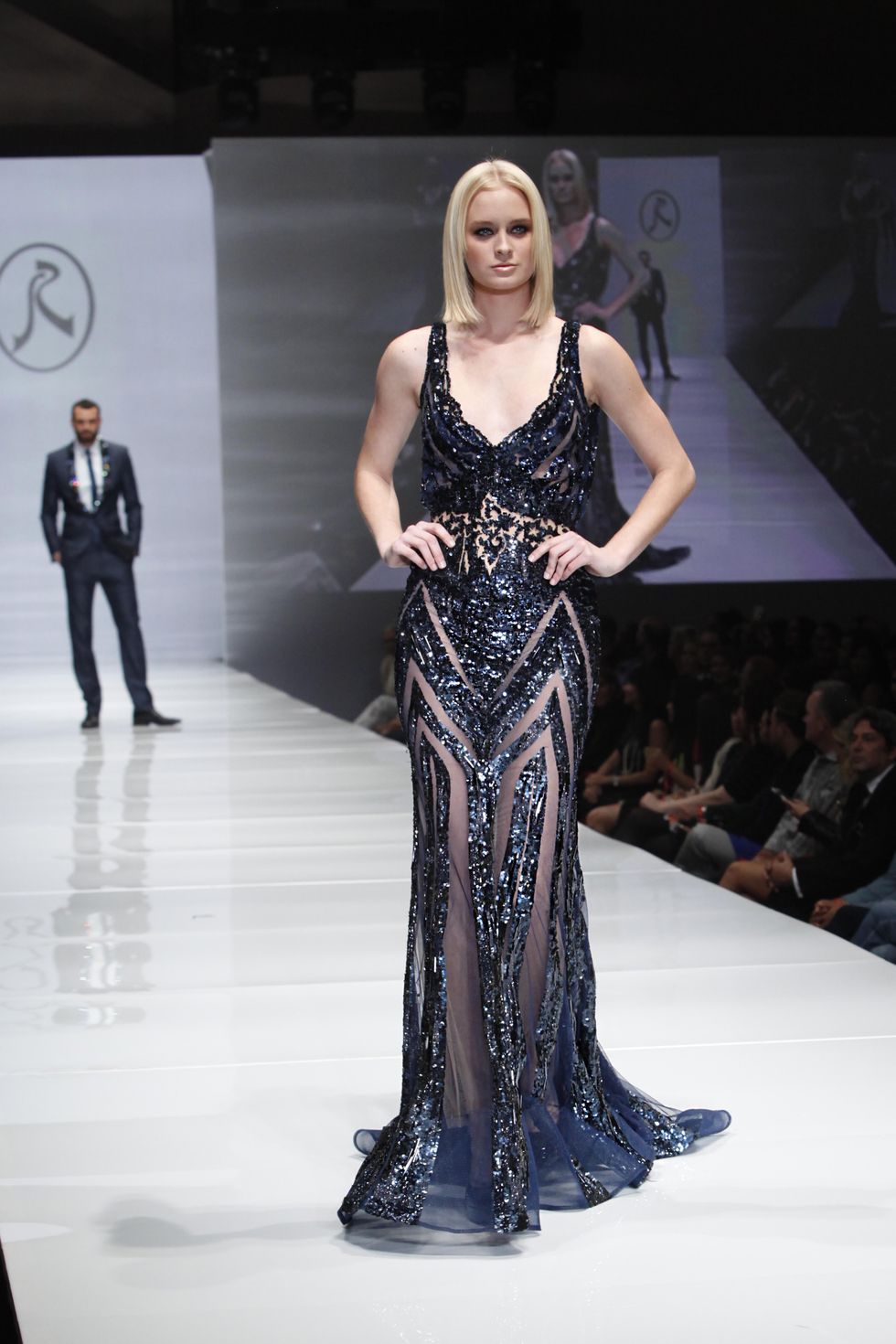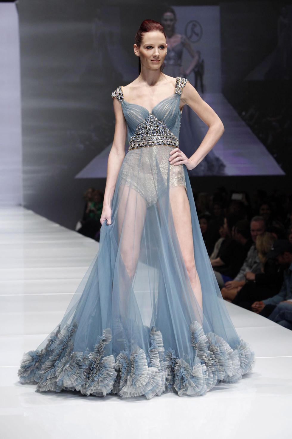While some of the looks seemed more suited to beauty pageants, Las Vegas shows or the 1980s camp classic TV series, Dynasty, many styles had the crowd awestruck. Ericka Bagwell and Ursaline Hamilton, on the front row, seemed particularly taken with a body-hugging purple beaded gown with squiggly waves that showed just the right amount of skin.