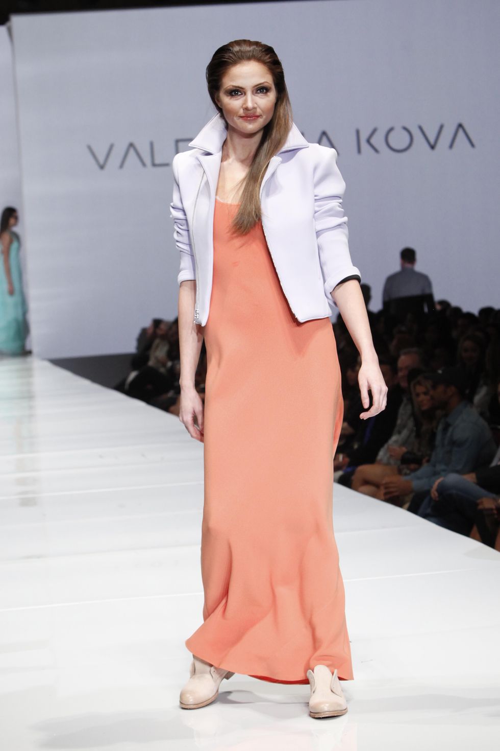 In her first full-scale runway show, Kova mixed primary colors with clean shapes for a fresh take on fashion for her hip customer. Included in the mix were languid robes, high-style military coats, bright orange or green gowns, tempered with pastel motorcycle jackets and a black evening gown with lace sleeves, emphasizing Kova's sweet and tough look.
