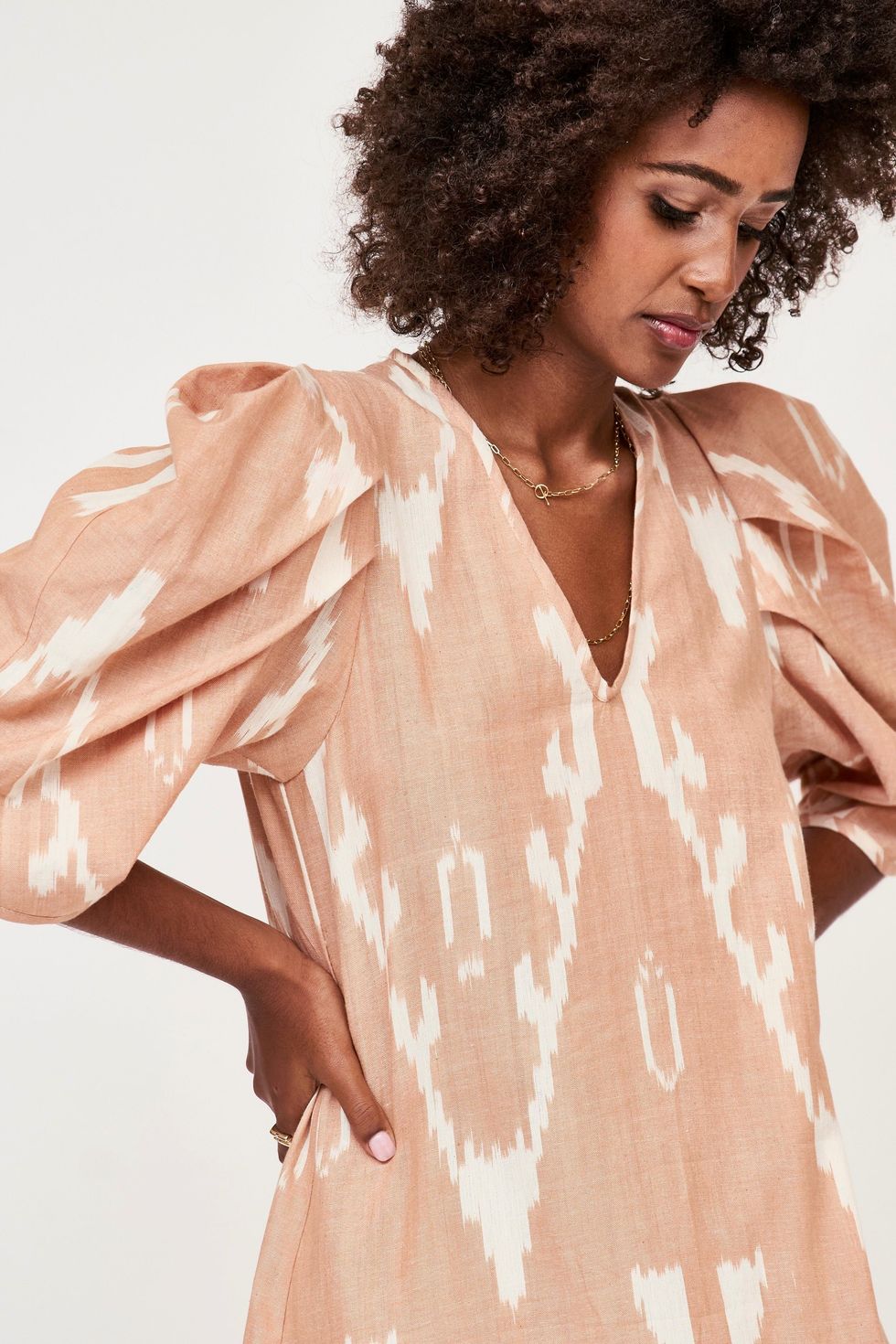 Cassis in Conch Ikat dress from Mirth features pleated puff sleeves with a curved opening and a deep v-neck and comes with either a scalloped or flat hem. It was hand loomed by weavers in south India, yarn by yarn, without electricity; ikat is made by dyeing batches of yarn using tie and dye methods before going on the loom to create the pattern.