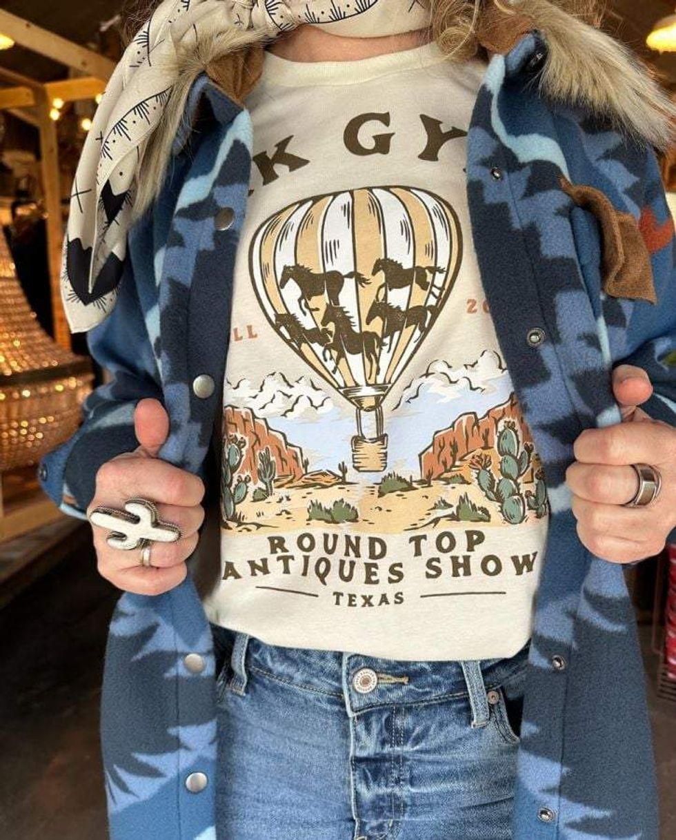 Amie and Jolie Sikes, the Junk Gypsy sisters, are making sure a trip to Round Top is not complete without an ultra-cool graphic tee. Custom-designed specifically for the Fall 2024 Show, the Texas-inspired designs are available in various colors and styles, including long sleeves, chambray, fleece, and pocket tees.