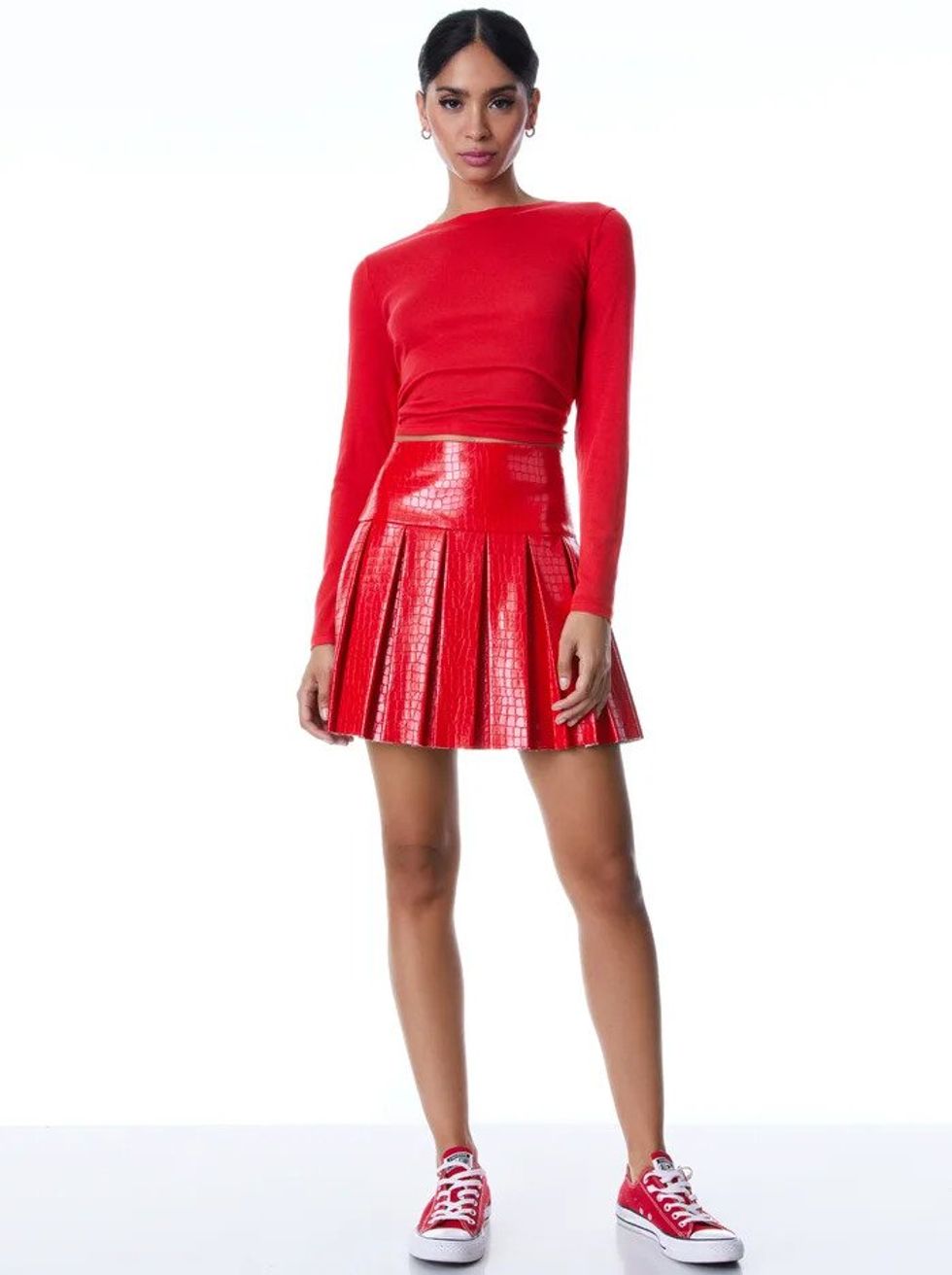 Swift was constantly seen in high-waisted red shorts during her iconic Red tour. The Emilie Vegan Leather Pleated Mini skirt by Alice + Olivia is a new updated play on the Red era. Go full red with a matching top, or break up the color blocking with black or white.