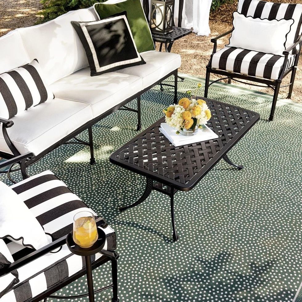More likely to change decor with seasonal trends? Buy neutral upholstery cushions and toss a cabana striped outdoor rug underfoot — it works in applications large and small.