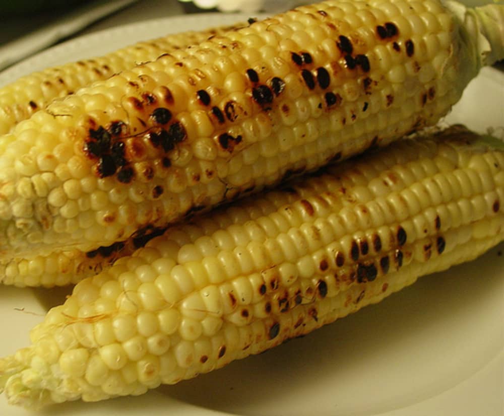 The secret to perfect grilled corn is to soak it in seasoned water for an hour before grilling. Use a little salt, sugar, onion and garlic powder for extra flavor. Skip the butter, brush with oil and roast away. Charring a kernel here and there adds character.