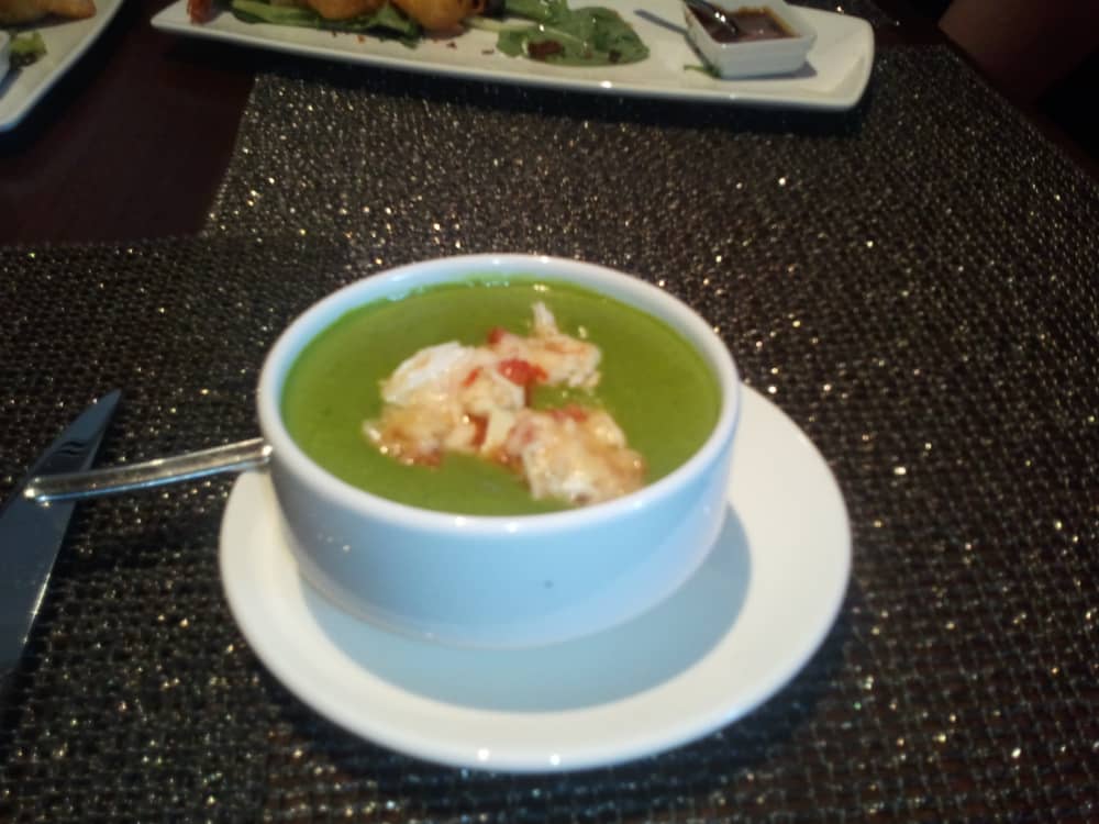 Jade soup, with spinach and broccoli cream and crabmeat gratinSarah Rufca