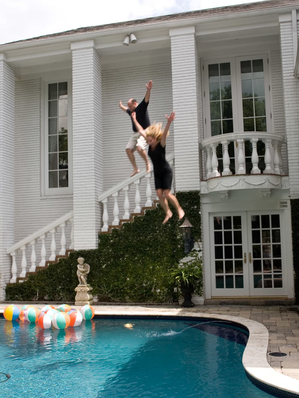The Spaldings are forever young at heart as seen in the photo of them jumpingfrom the balcony at their home into the pool.