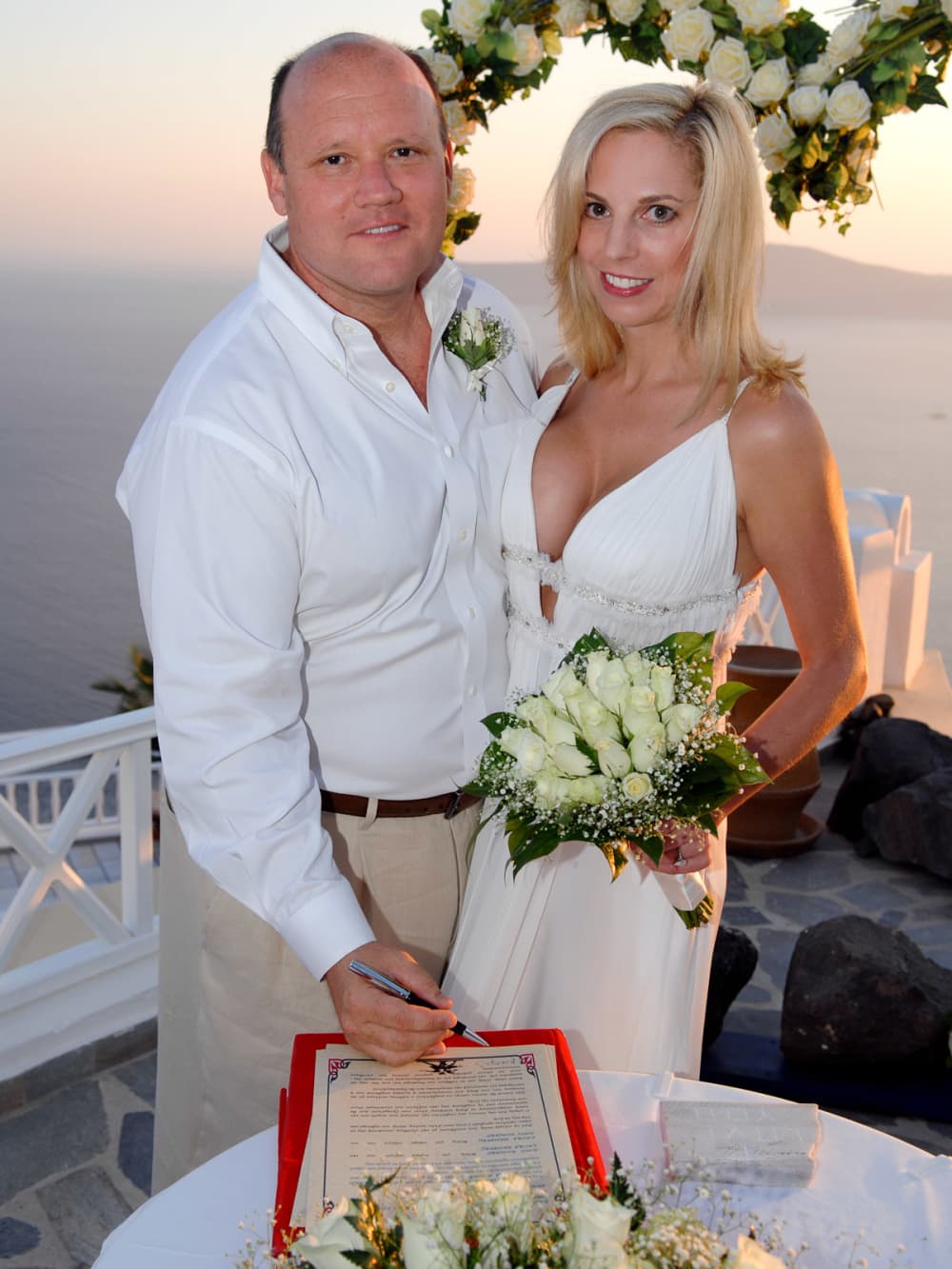 Fast forward a decade. Laura stopped practicing law to raise a family. They had two children together. And they remained so much in love that they were married again on their 10th anniversary. But this time it was in Santorini, Greece. They have the papers — in English and in Greek — to prove it.