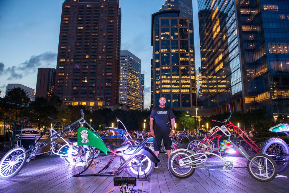 More than 2,000 gathered on the lawn in front of the Anheuser-Busch Stage for the performance by the Aaron Neville Quintet featuring Charles Neville. Adding to the fun was the display of "chopper bicycles" built by Workshop Houston's "chopper"kids.