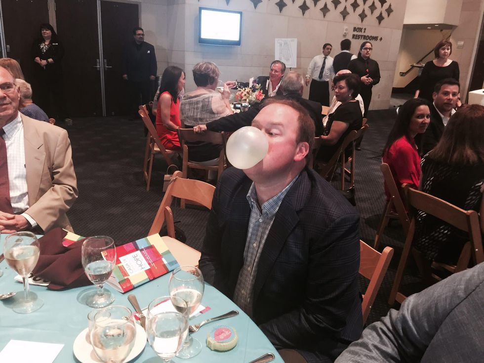 KTRK Channel 13 news anchor Tom Koch, who served as dinner emcee, launched the "Pop for Hope" campaign by attempting to blow bubble gum bubbles from the podium. While that effort was not exactly medal-worthy, he did challenge NASA's Scott Kelly, Houston Rocket James Harden and Houston Texan J.J. Watt. This writer assisted Koch by attempting to blow bubbles from the jar of liquid and by challenging H-E-B's Scott McClelland, who was in the crowd of more than 600.