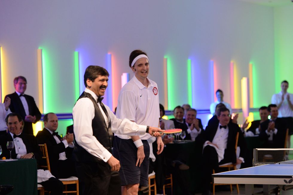Then they took on a a couple of good-natured volunteers in the tuxedoed crowd. James Stewart, the son of Menil trustee Bill Stewart, gamely competed against one of the champions, who provided him with a larger paddle at one point. Niraj Oak, chief technology officer at Linbeck, the construction company that built the new Bistro Menil, showed his prowess in a close game against Butler. Oak has represented the U.S. in the World Table Tennis Championships.