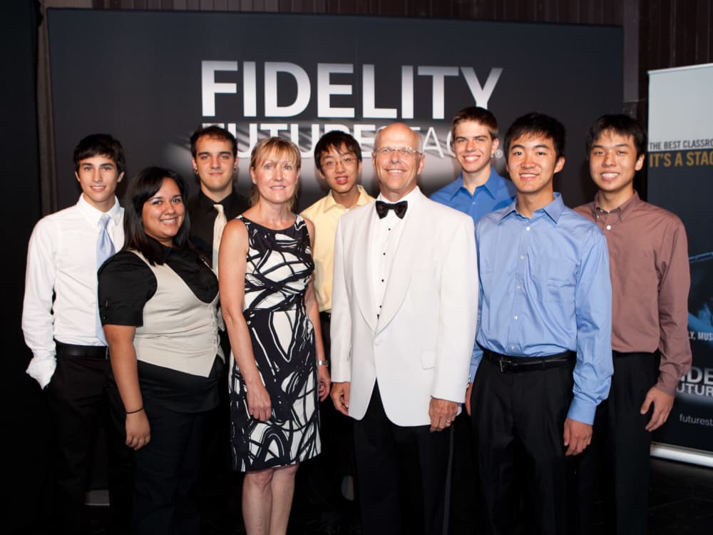 • Jeanie Reckart and Michael Krajewski surrounded by the winners of the FidelityFuturestage Music Competition