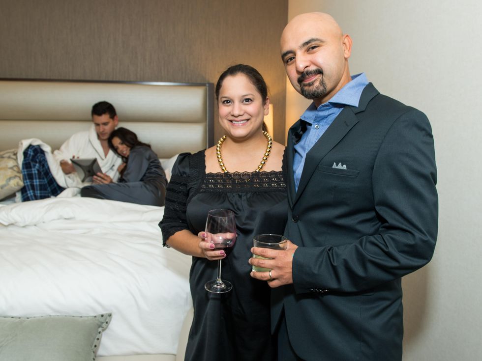 In the suite, a couple clad in silk pajamas lounged in the king-size bed while ordering room service from the iPad menu. Party guests joined the animation, jumping into the suite's cylindrical bathtub for photos. In the biz center conference room, actors played out a lively business meeting.
