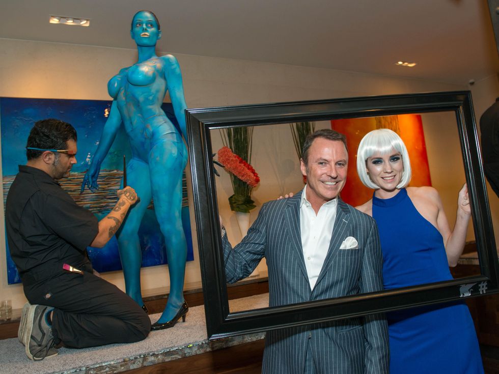 More than 700 revelers poured in for the "interactive" celebration that began in the hotel lobby where near-naked women were being dressed in body paint by local artists, and progressed through three additional venues with food, drink and entertainment changing at each. Welcoming guests was a violinist on stilts, dressed in a golden gown and headdress, setting the high vibe tone of the party.